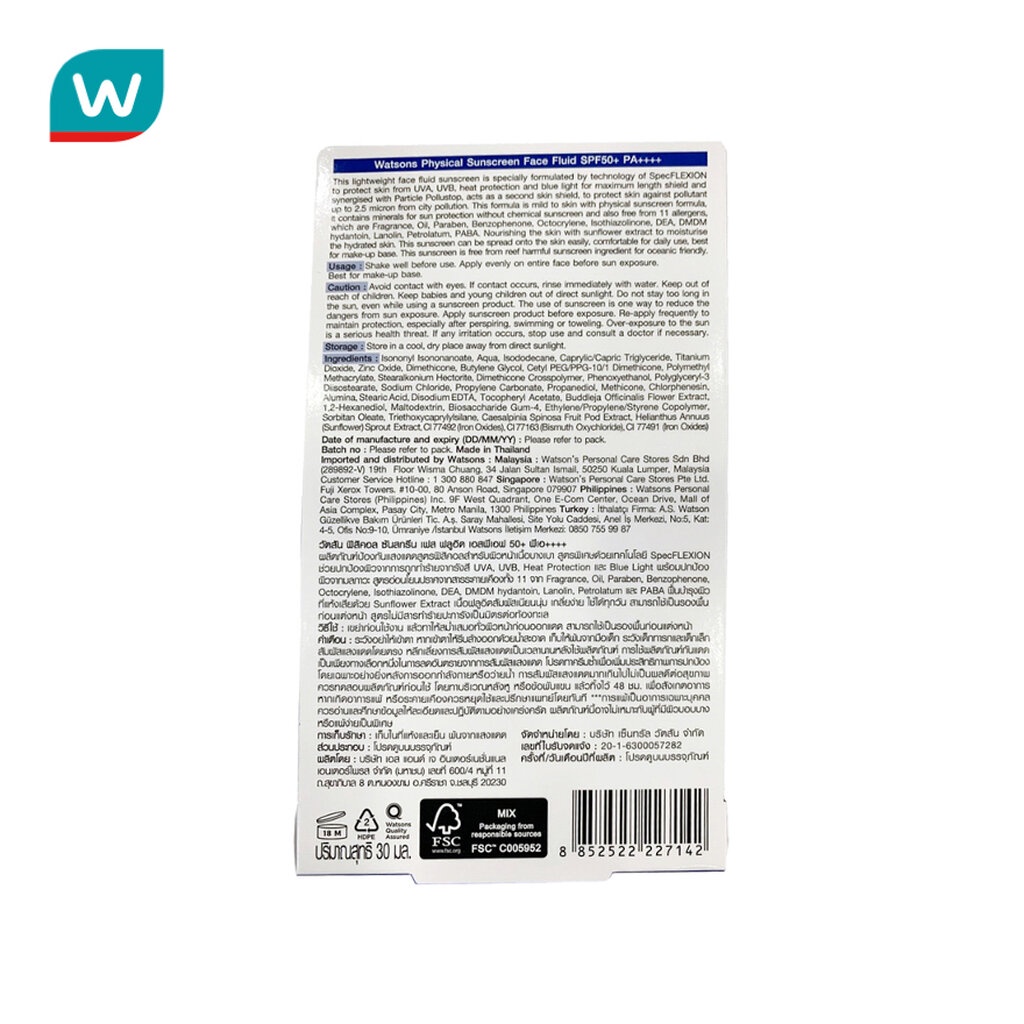 Watsons วัตสัน ฟิสิคอล ซันสกรีน เฟส ฟลูอิด เอสพีเอฟ 50+ พีเอ++++ 30มล