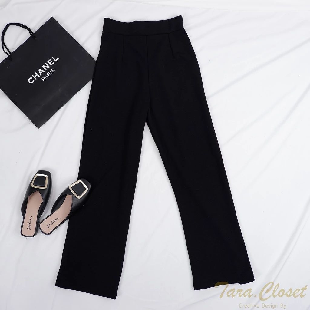 กางเกงขายาวผู้หญิง เอวสูง ขากระบอก เนื้อผ้าวูลเวฟ ผ้ายืด ใส่ทำงาน/ใส่สบาย กางเกงสแล็คผู้หญิง สีดำ Size S