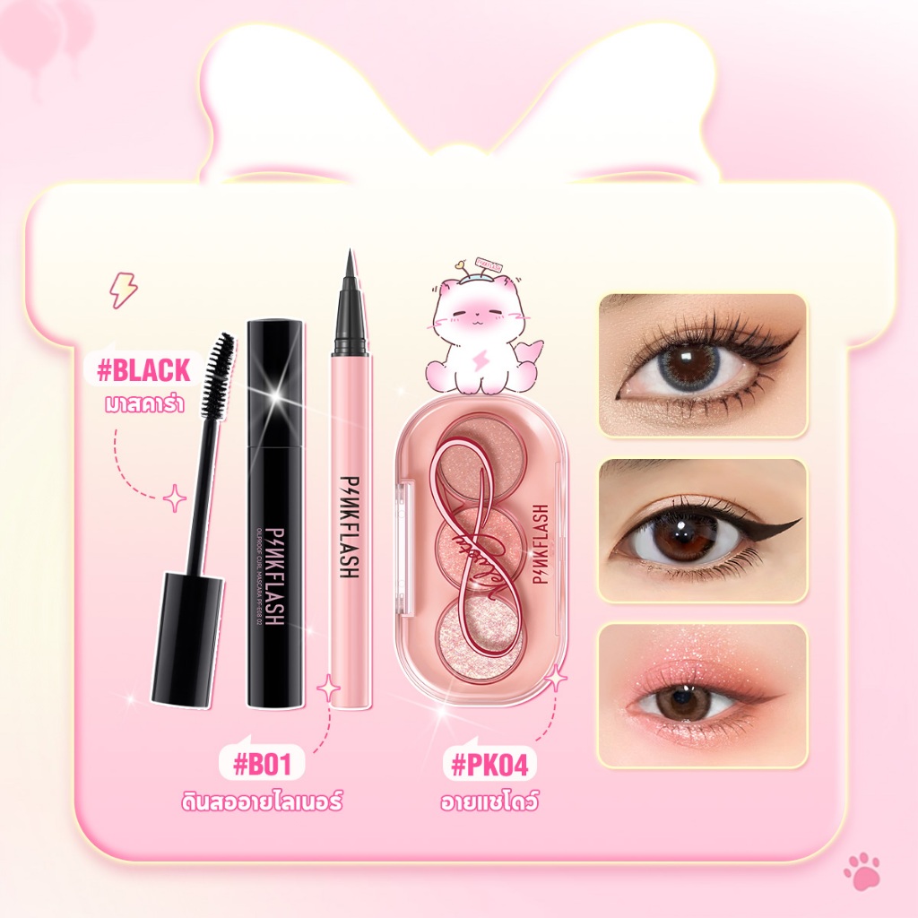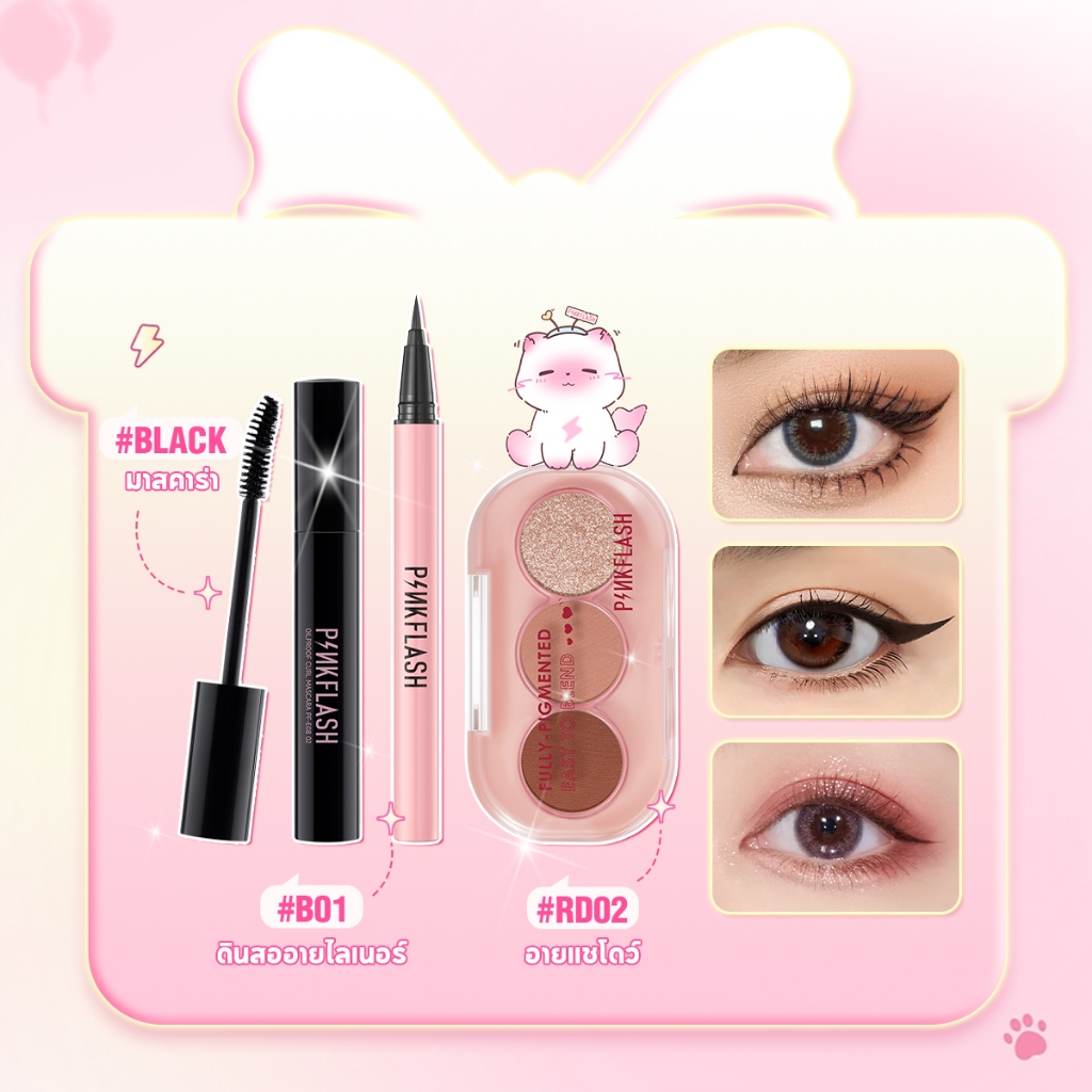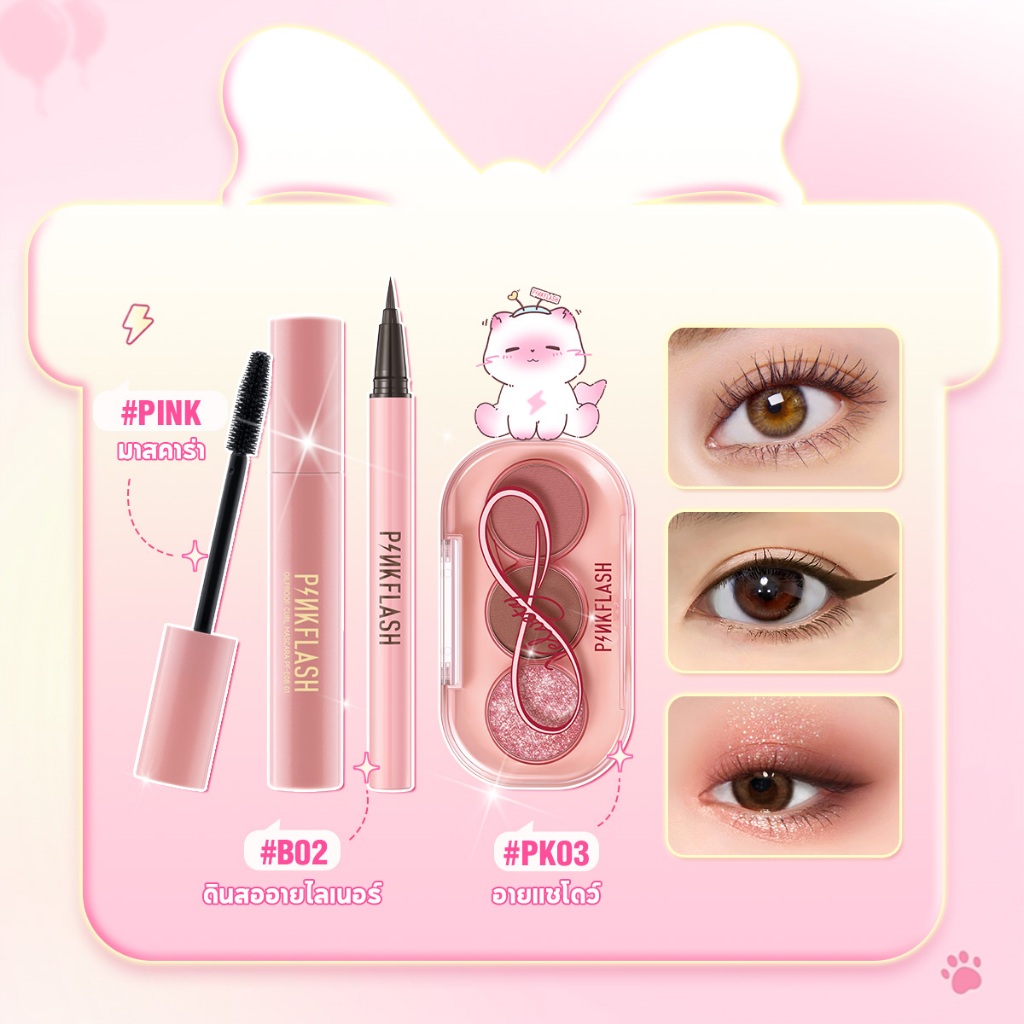 PINKFLASH 3 ชิ้นชุดแต่งหน้าตาติดทนนานมาสคาร่ากันน้ําอายไลเนอร์สีดําอายแชโดว์ Pattle
