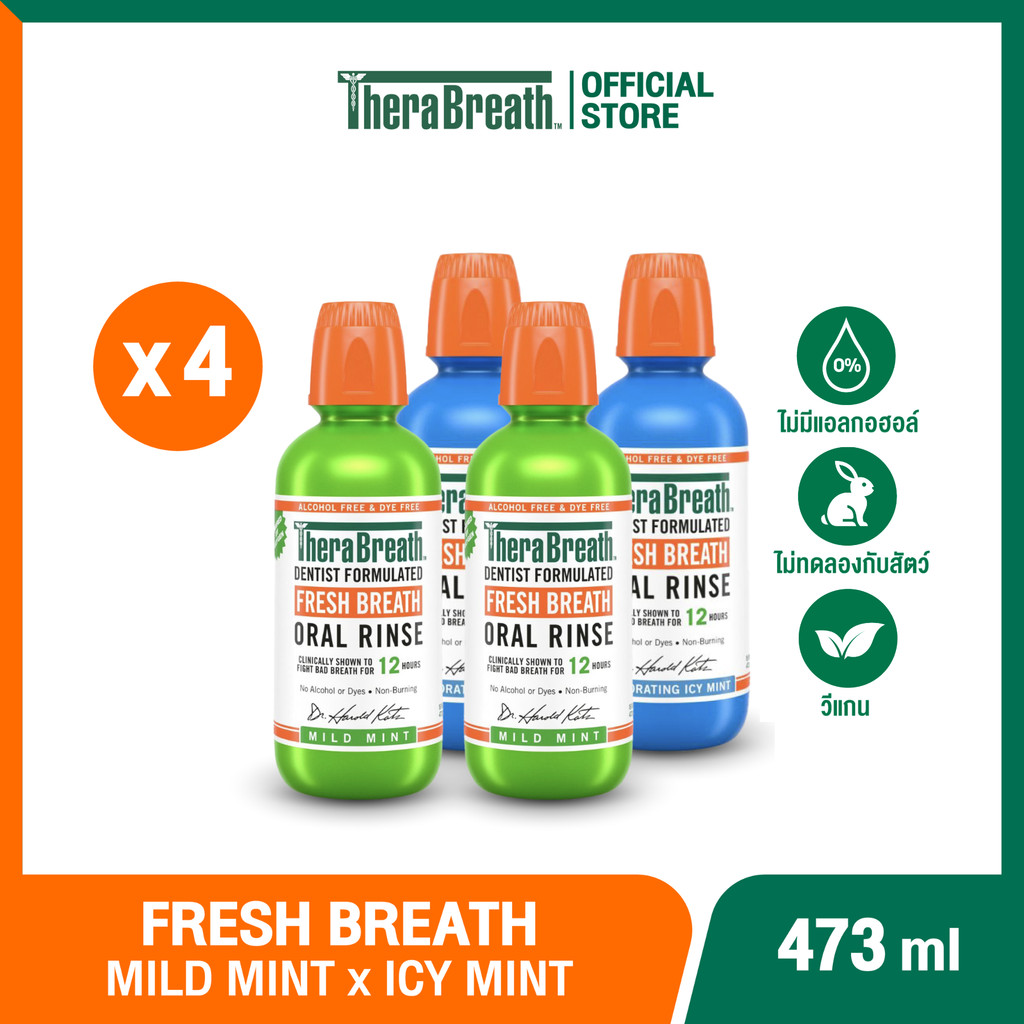 [แพ็คx4] TheraBreath 473 ml สูตร Mild Mintx2 x Invigorating Icy Mint x2 - Mouthwash น้ำยาบ้วนปาก ไม่มีแอลกอฮอล์