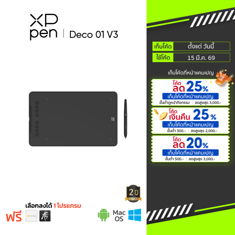 XPPen Deco 01 v3 (Windows/Mac/android) เมาส์ปากกา 10x6.25นิ้ว / แรงกด 16K / รับประกัน 2 ปี