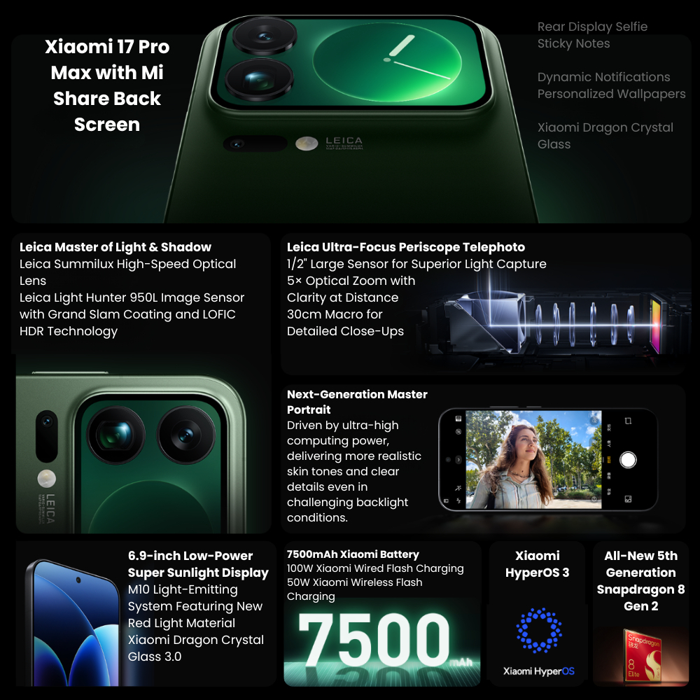 Xiaomi 17 Pro Max Snapdragon 8 Elite Gen 5 6.9" LTPO AMOLED 120Hz 7500mAh 100W Xiaomi HyperOS 3