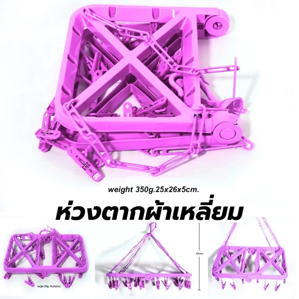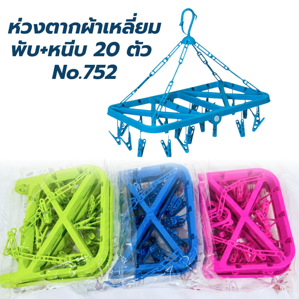 ห่วงตากผ้าเหลี่ยมเล็กพับ พลาสติก มีที่หนีบผ้า 20ตัวหนีบ ทรงสี่เหลี่ยม no.752
