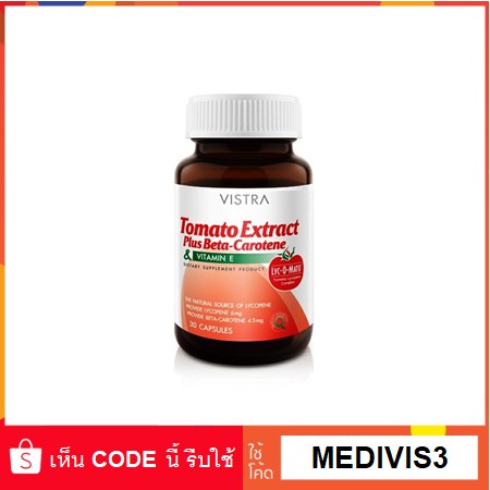Vistra Tomato Extract Plus Beta-Carotene & Vitamin E วิสทร้า สารสกัดมะเขือเทศวิตามินอี 30เม็ด 06552
