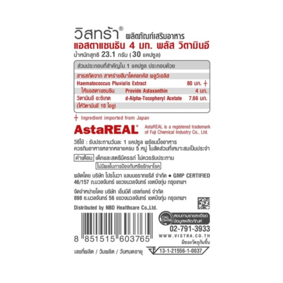 Vistra Astaxanthin Plus Vitamin E 4 mg วิสทร้า แอสตาแซนธิน 4 มก ขนาด 30 แคปซูล 05139