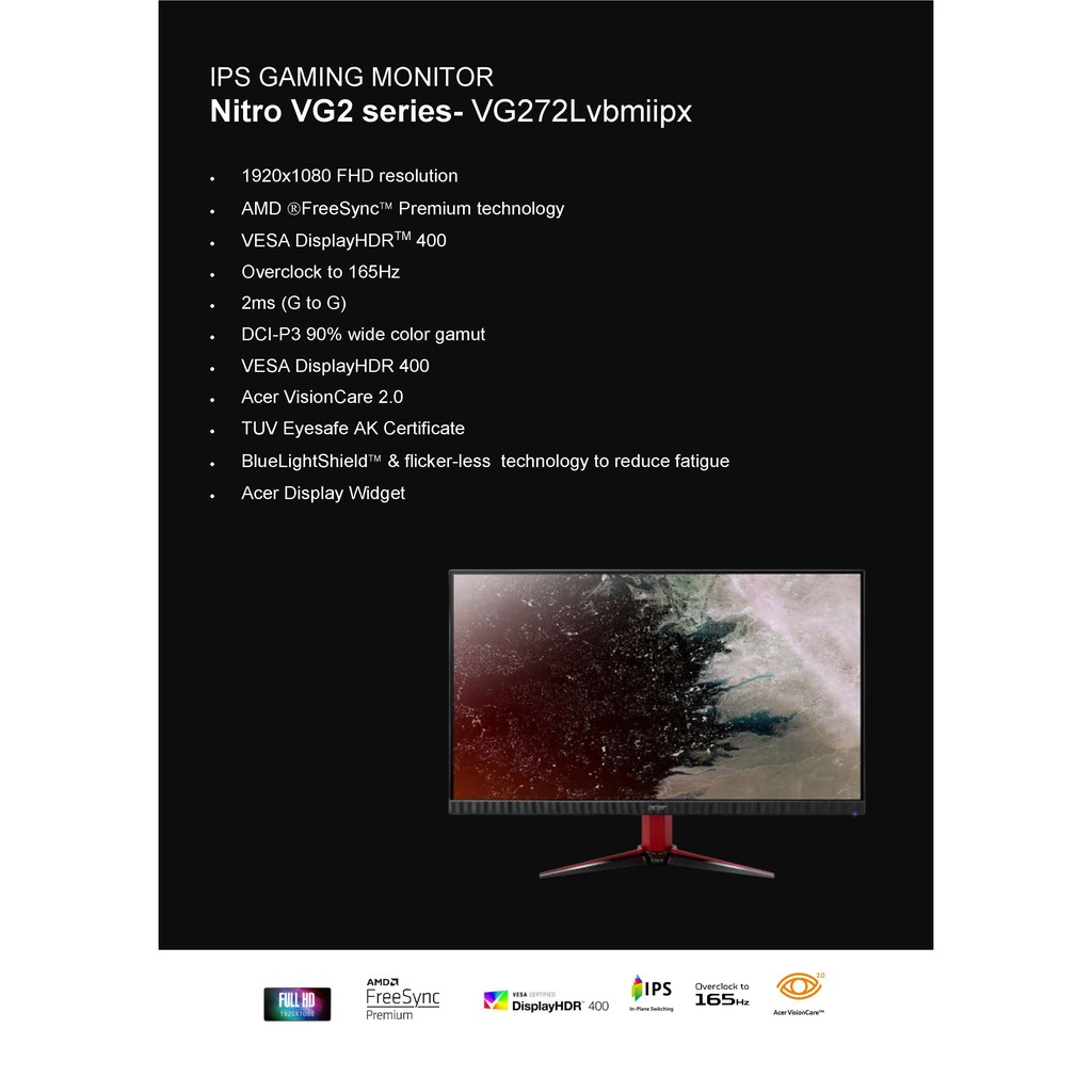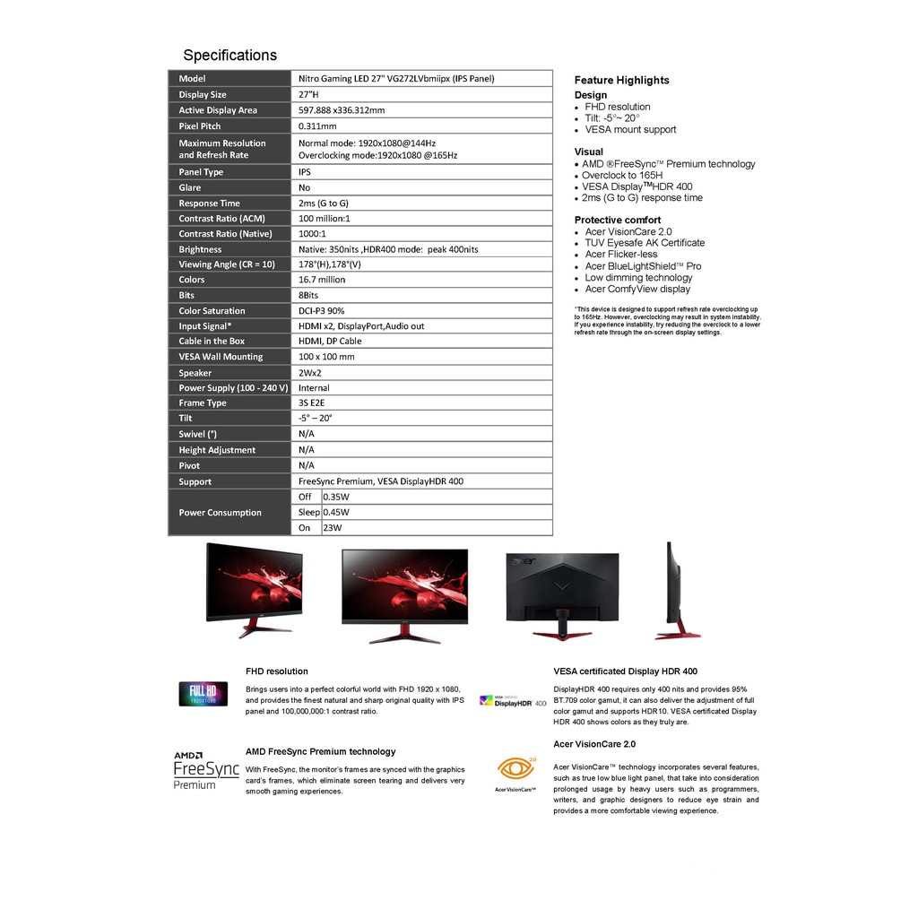 ACER Monitor รุ่น VG272Lvbmiipx 27" IPS (FHD,HDMI,DP,SPK) 144Hz-OC 165Hz ประกัน 3 ปี