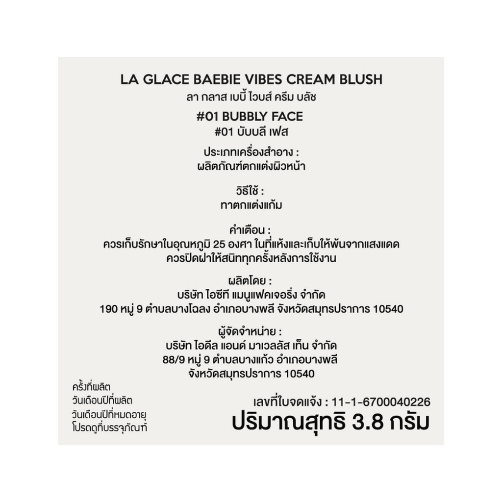 LA GLACE ลากลาส เบบี้ ไวบส์ ครีม บลัช 3.8g. 01 บับบลี่ เฟซ