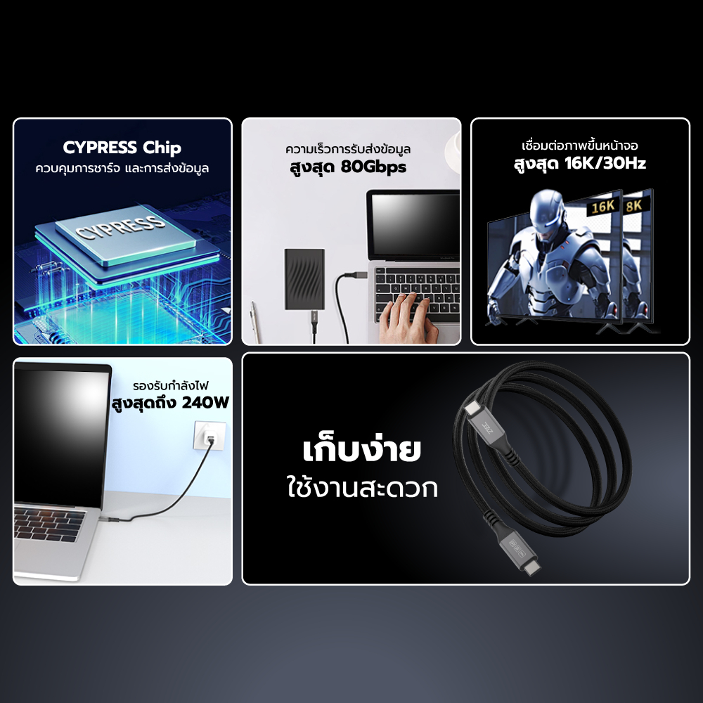 [ลดเหลือ 749] ZTEC ZC661 สายชาร์จเร็วแบบแม่เหล็ก 240W USB-C to USB-C Thunder 5,USB 4 รองรับเชื่อมต่อภาพ 16K -24M