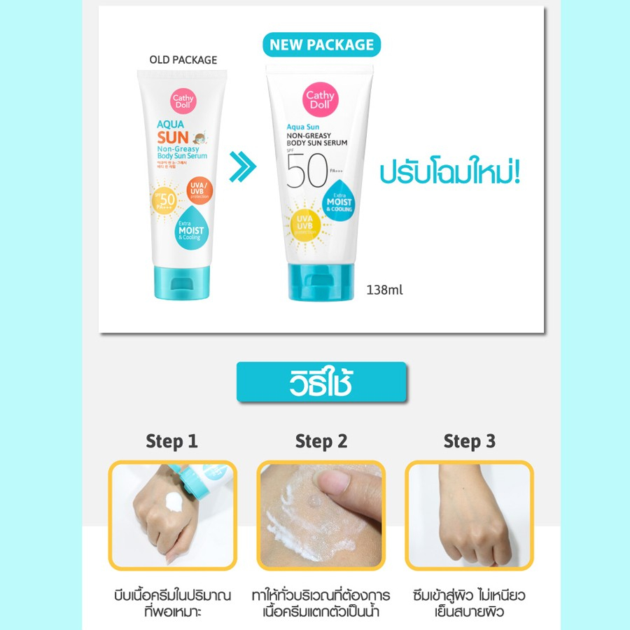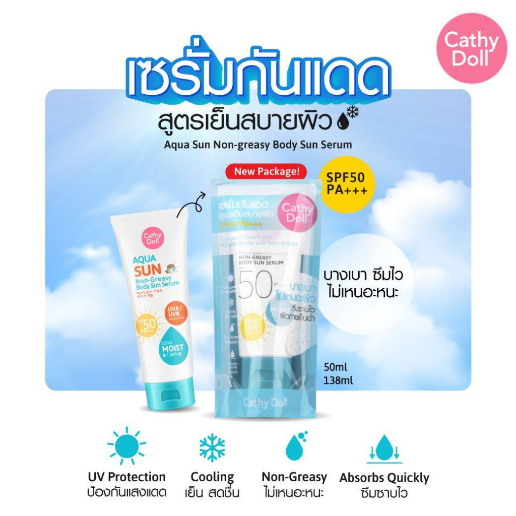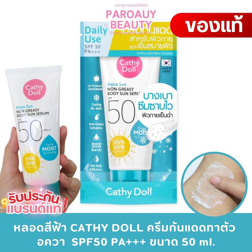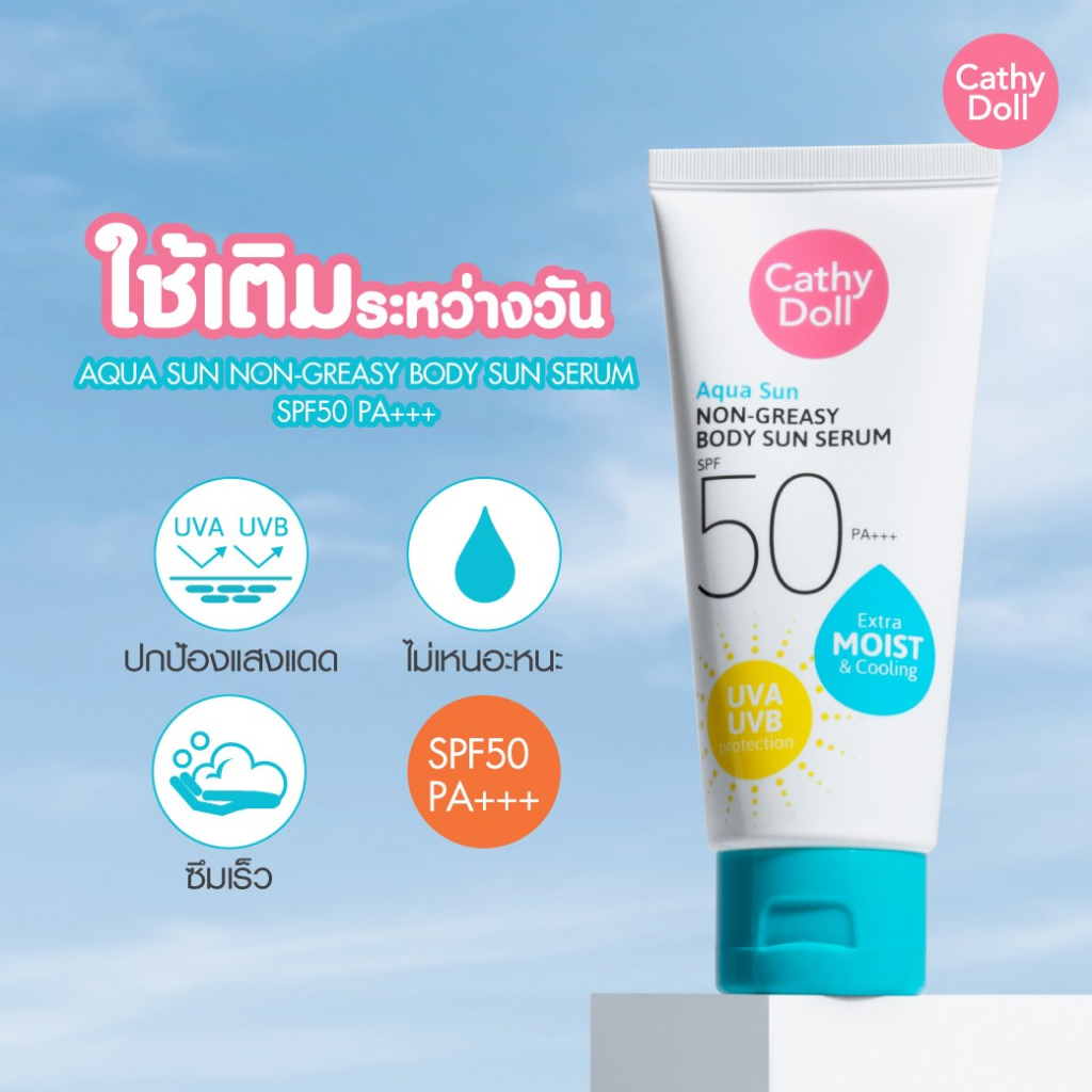 หลอดสีฟ้า CATHY DOLL ครีมกันแดดทาตัว อควา ซันนอนเกรซี่บอดี้ซันเซรั่ม SPF50 PA+++ ขนาด 50 ml.