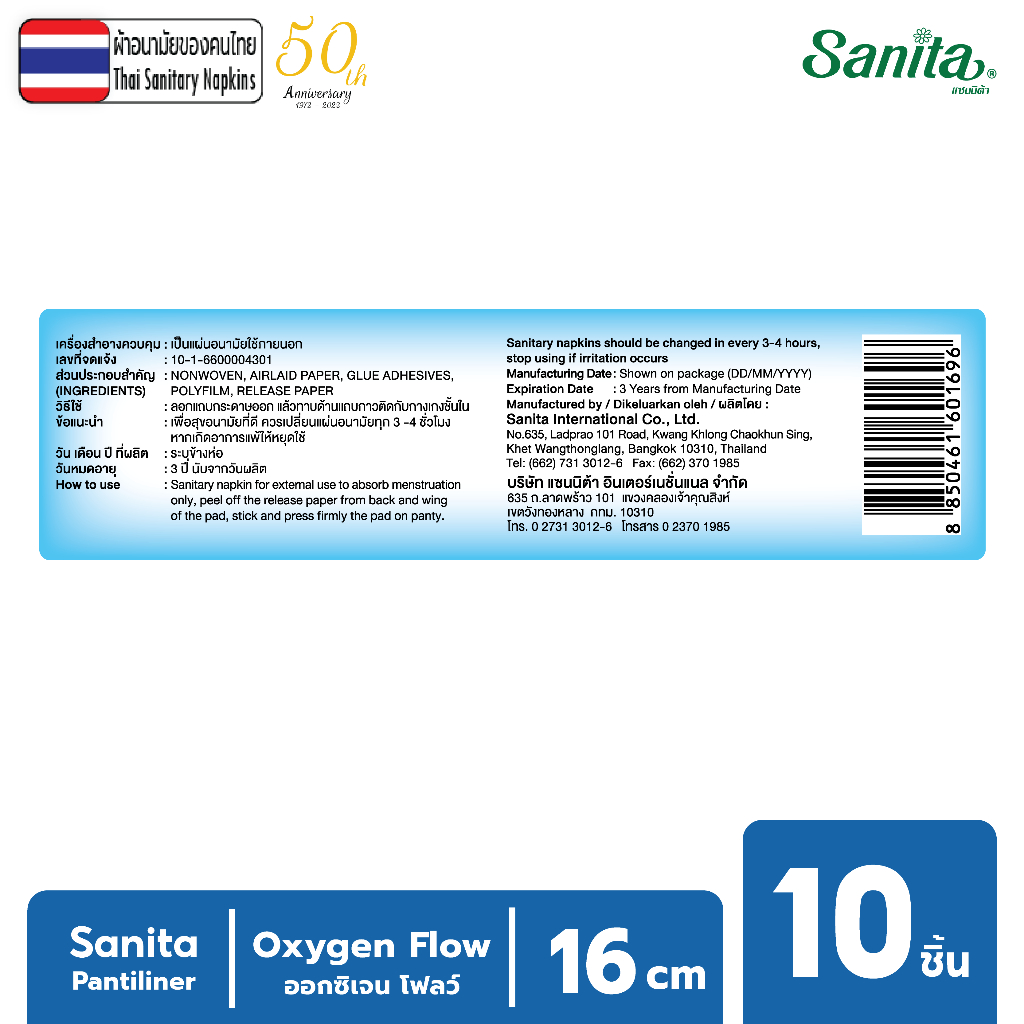 [ยกโหล12ห่อ] Sanita Pantiliner Oxygen Flow 10s / แซนนิต้า แผ่นอนามัย ออกซิเจนโฟลว์ 10ชิ้น/ห่อ