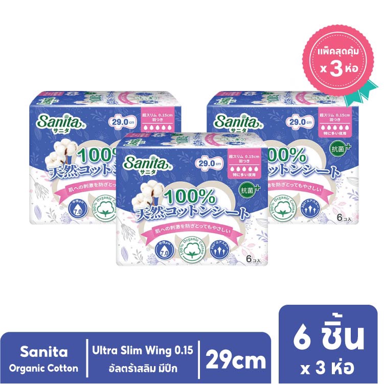 [แพ็ค X 3ห่อ] Sanita / แซนนิต้า 100% ออร์แกนิค คอทตอน อัลตร้าสลิม มีปีก 29.0ซม. 6ชิ้น/ห่อ