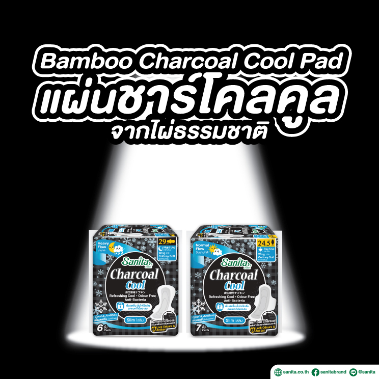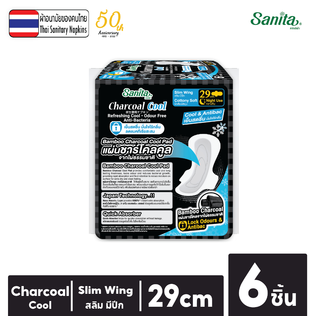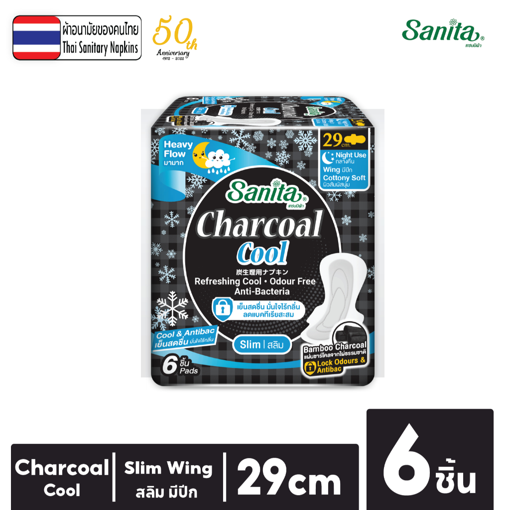 Sanita Charcoal Cool / แซนนิต้า ผ้าอนามัย ชาร์โคล คูล สลิม มีปีก 29.0ซม. / 6 ชิ้น/ห่อ (เย็นสดชื่น )