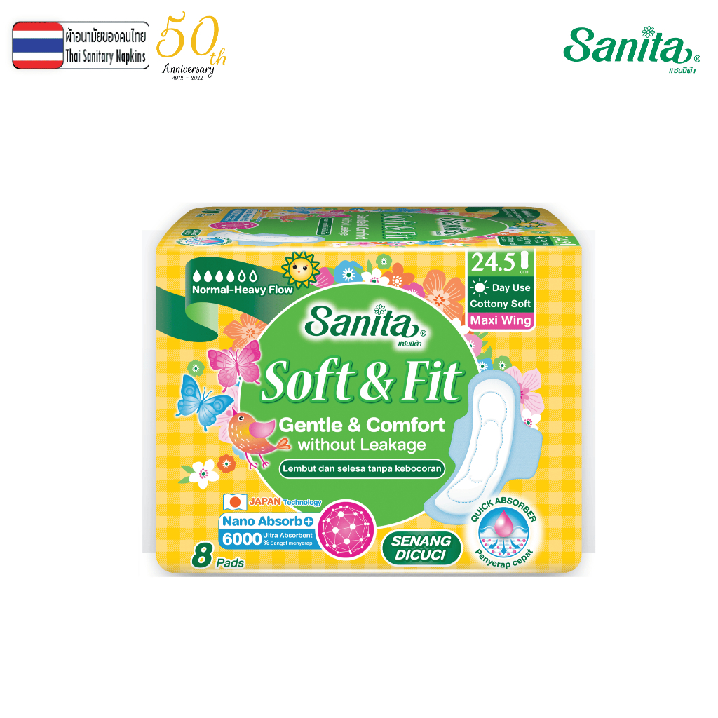 Sanita / แซนนิต้า ผ้าอนามัย ซอฟท์ & ฟิต ผิวสัมผัสนุ่ม แม็กซี่ มีปีก 24.5ซม. 8ชิ้น/ห่อ