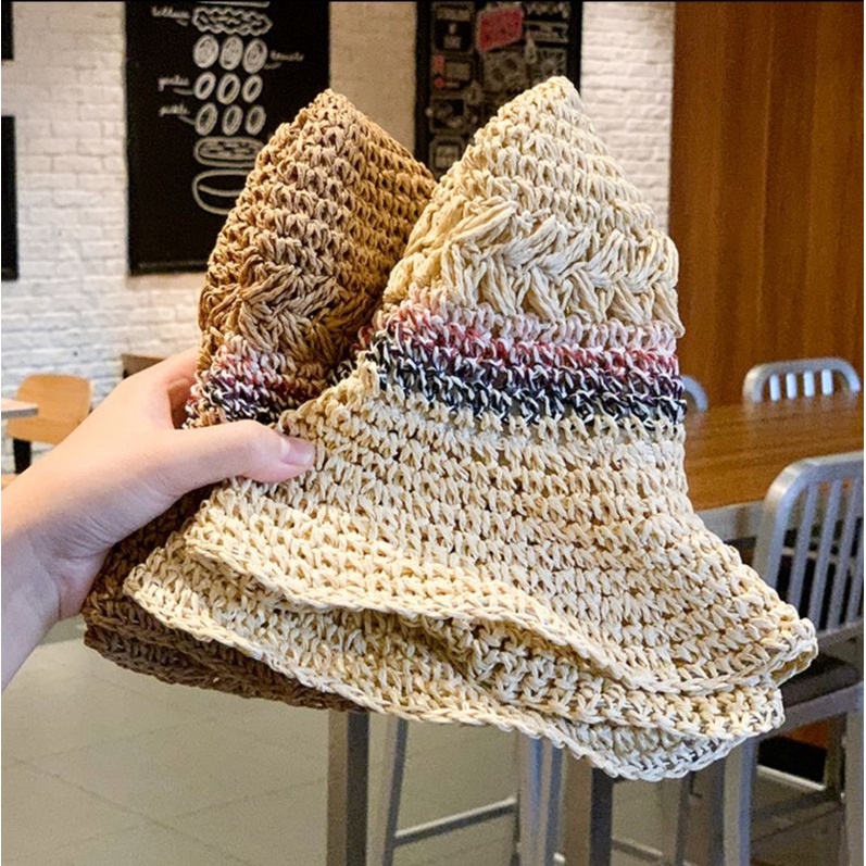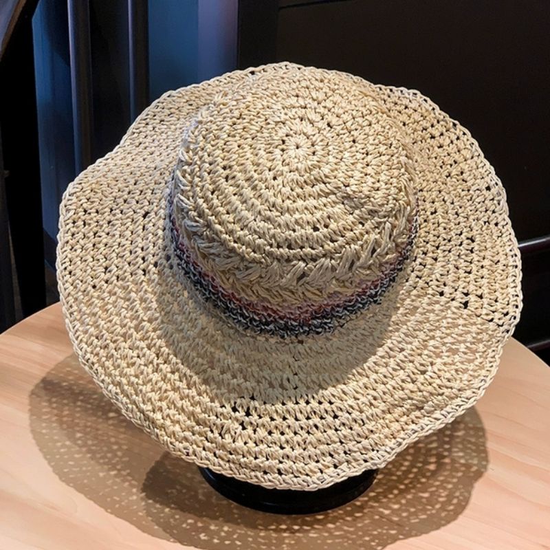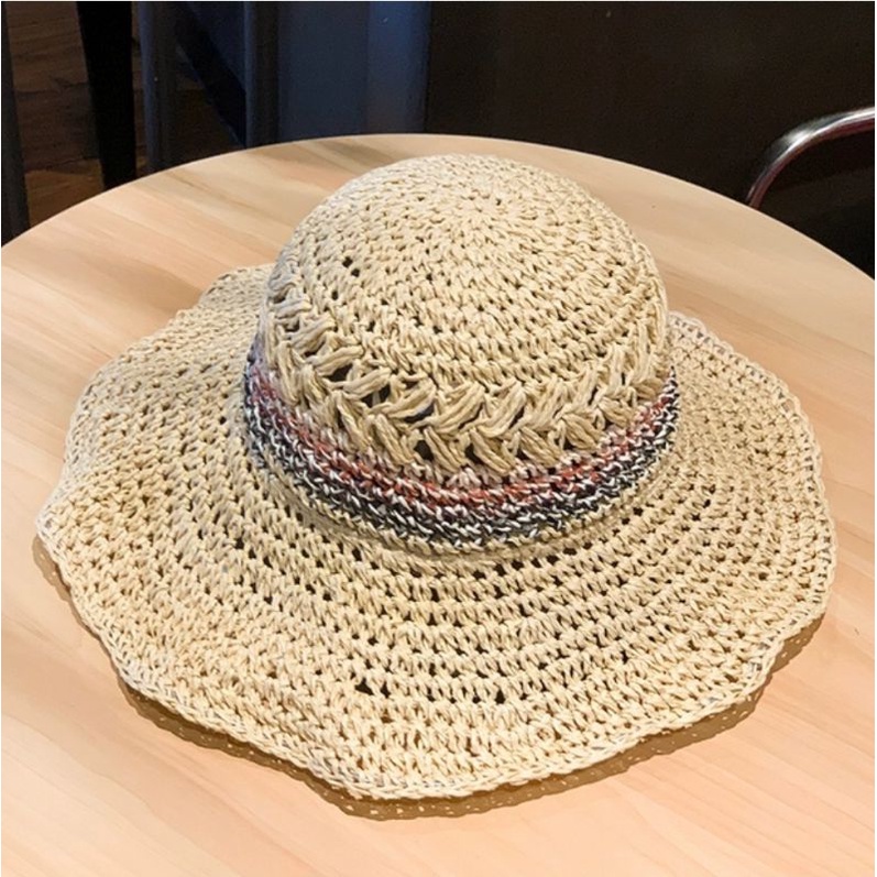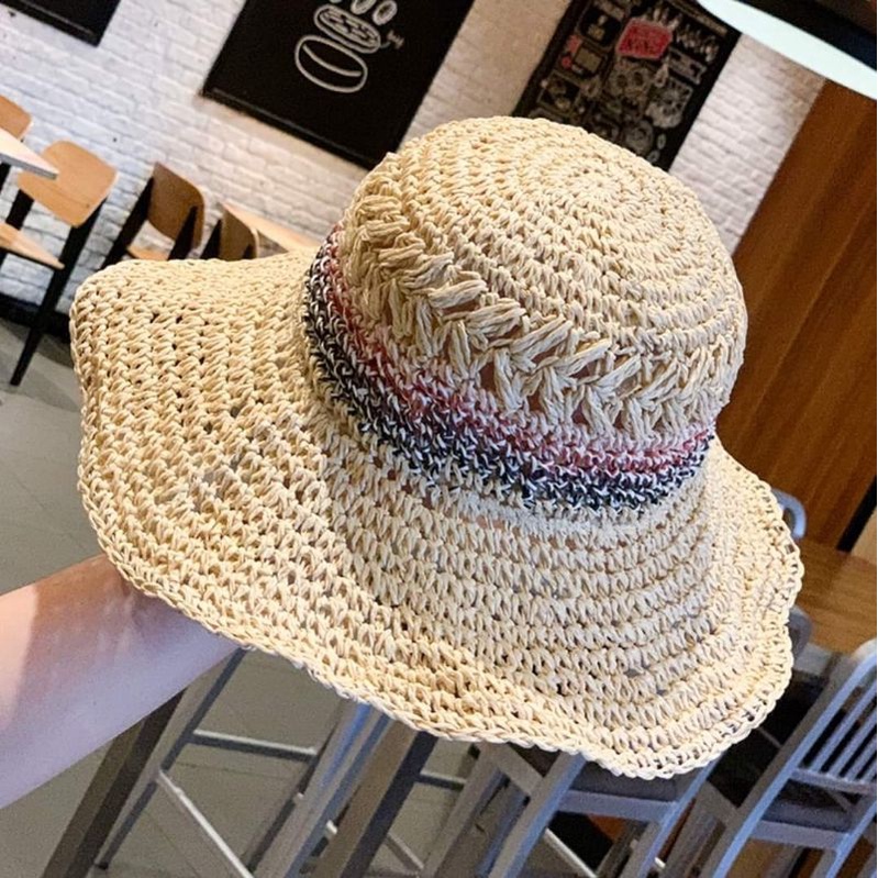 โค้ดหน้าร้านลดเพิ่ม30.- 🕊__หมวกสานลายสามสี มีเชือกผูกโบ พับได้ไม่เสียทรง