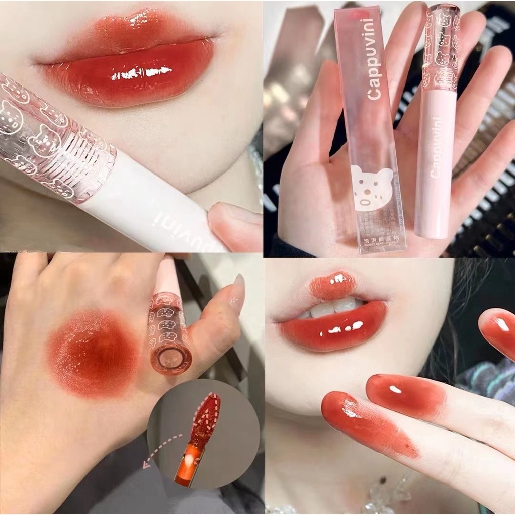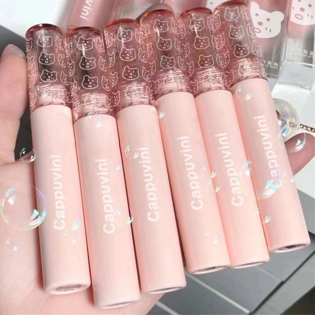 Cappuvini บับเบิลแบร์ กระจกน้ํา หญ้า สีชา ลิปสติก ลิปกลอส เคลือบริมฝีปาก สีนู้ด ธรรมชาติ