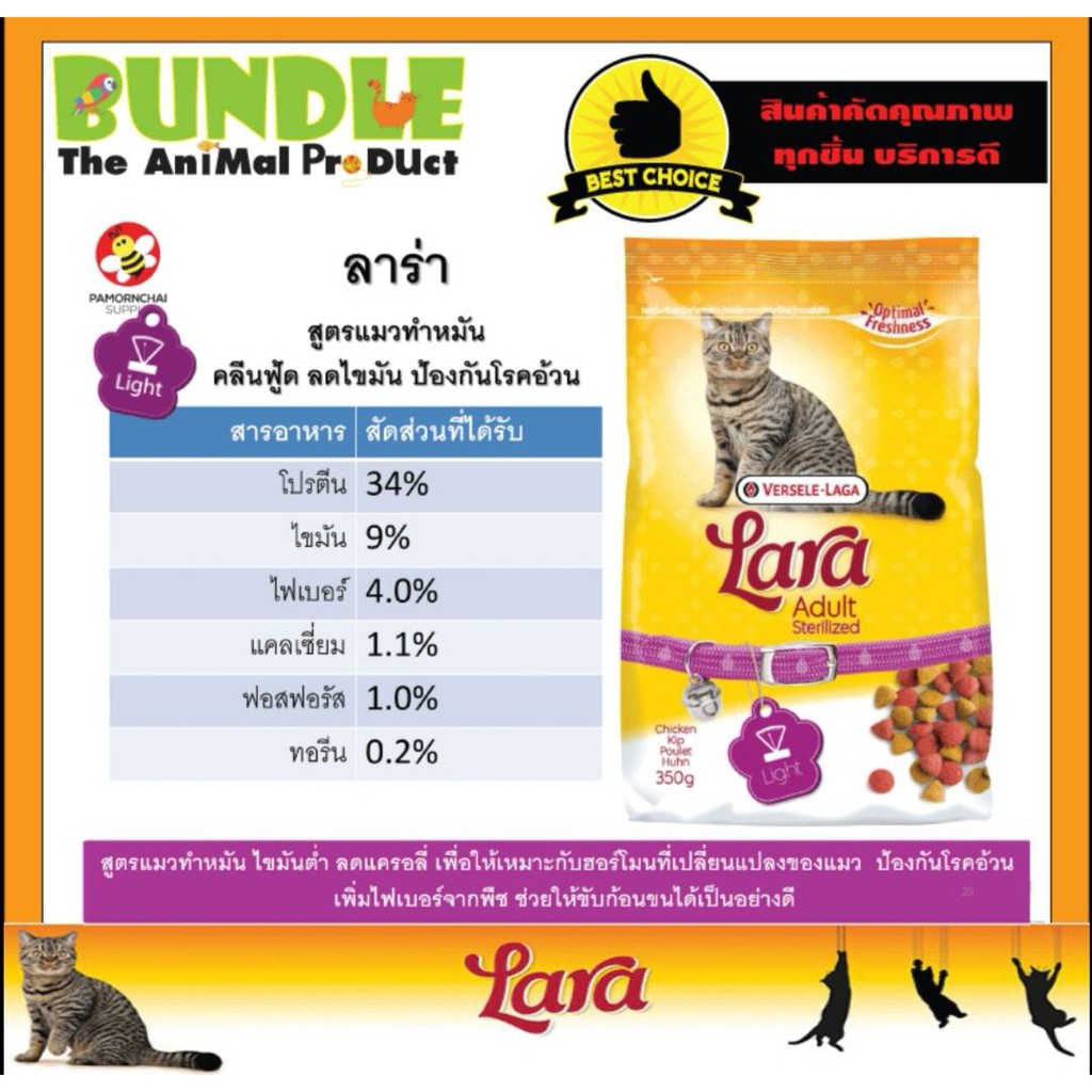 Lara Adult Sterilized 2 Kg. อาหารแมวทำหมัน อาหารแมวควบคุมน้ำหนัก อาหารแมวลาร่า ไขมันต่ำ สูตรเนื้อ ไก่ ขนาด 2 กิโลกรัม