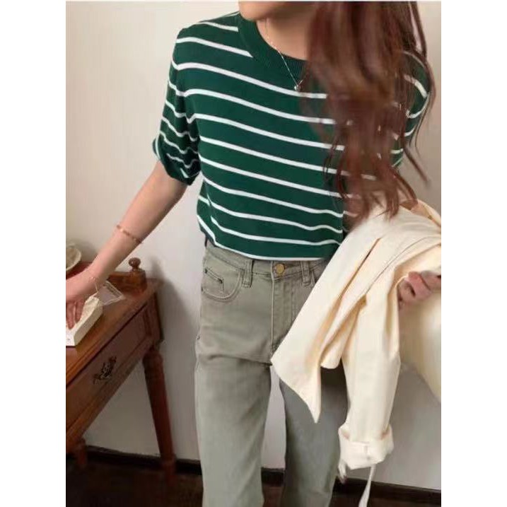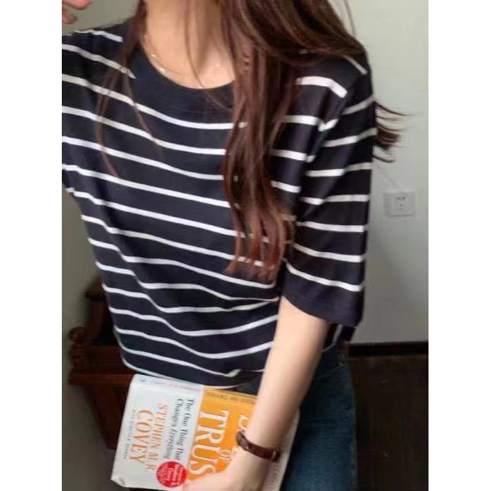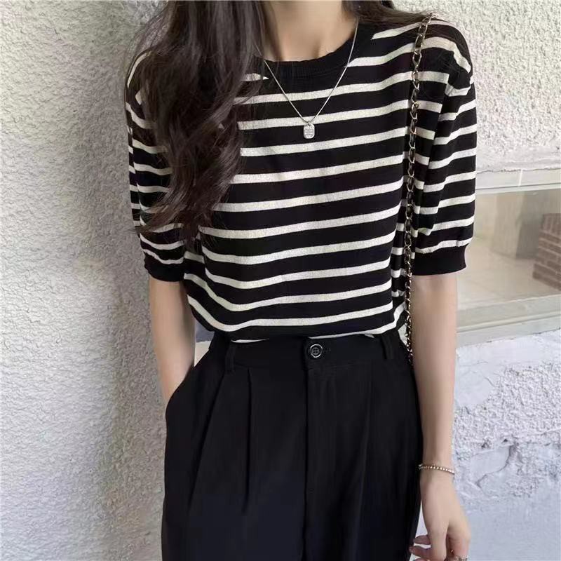 💕*Miki-Shop😍พร้อมส่ง*เสื้อยืดไหมพรม* อย่างดี แขนสั้น* ลายทาง*268