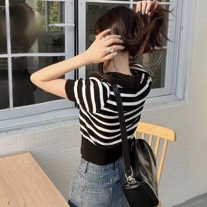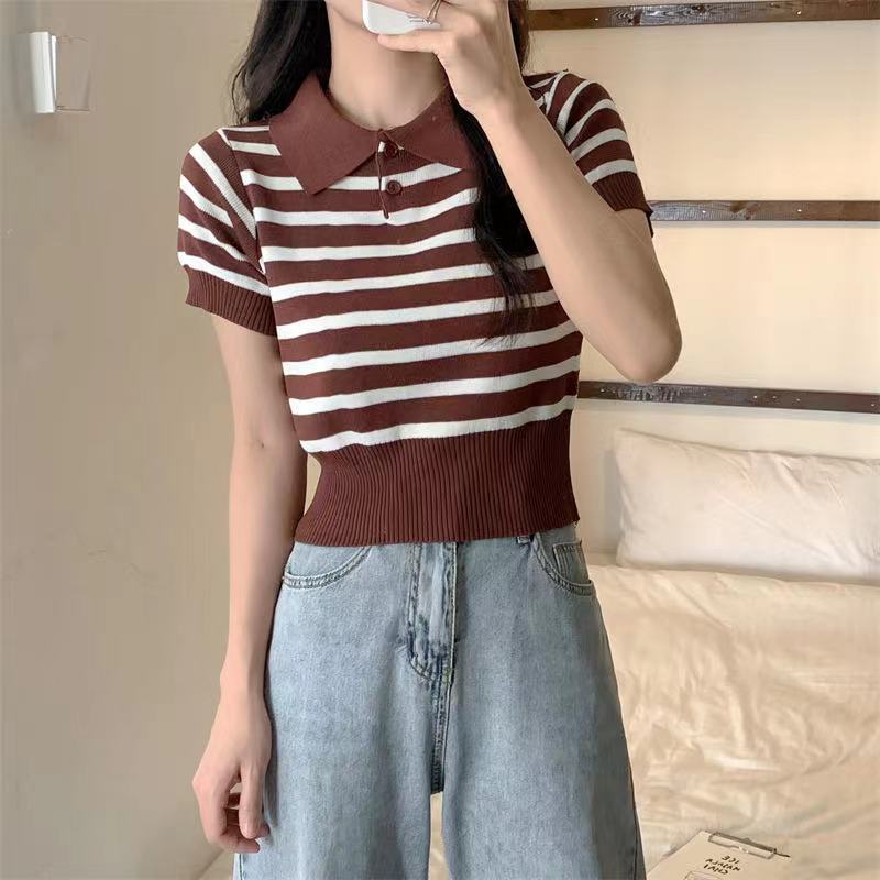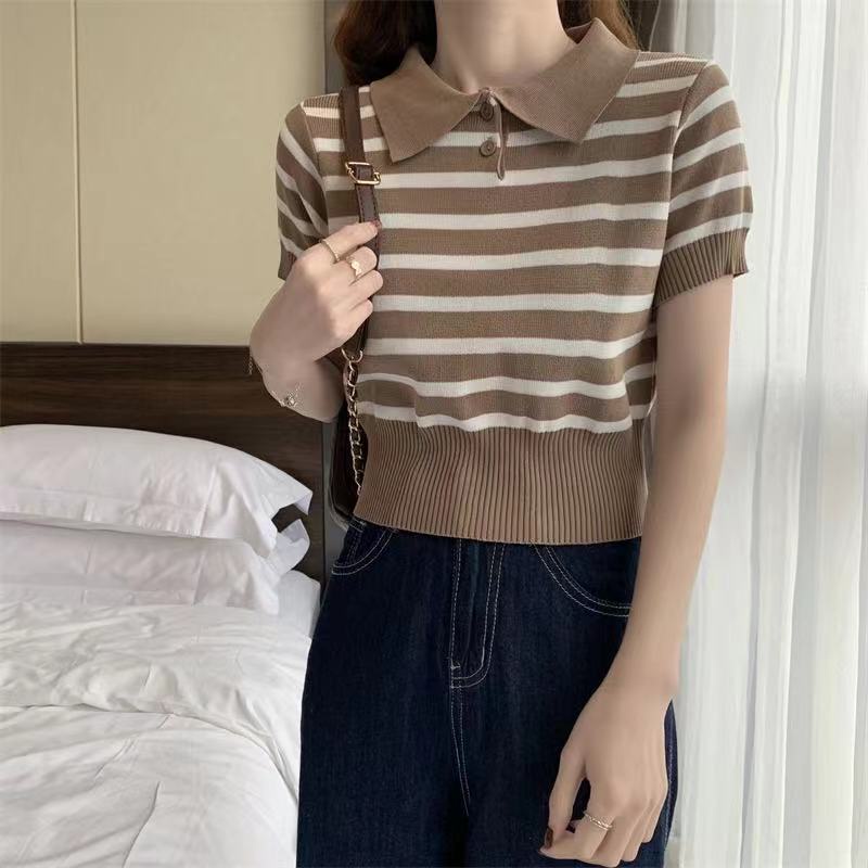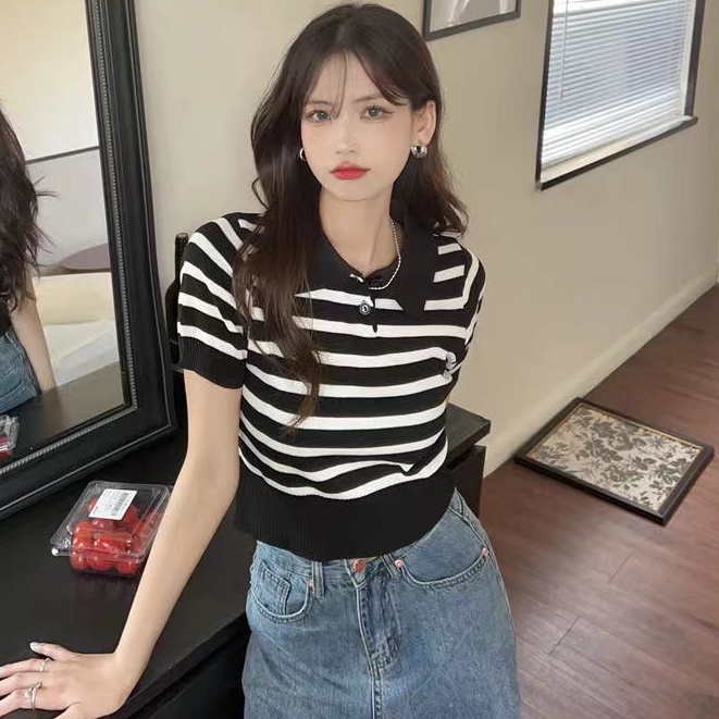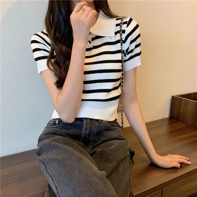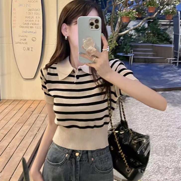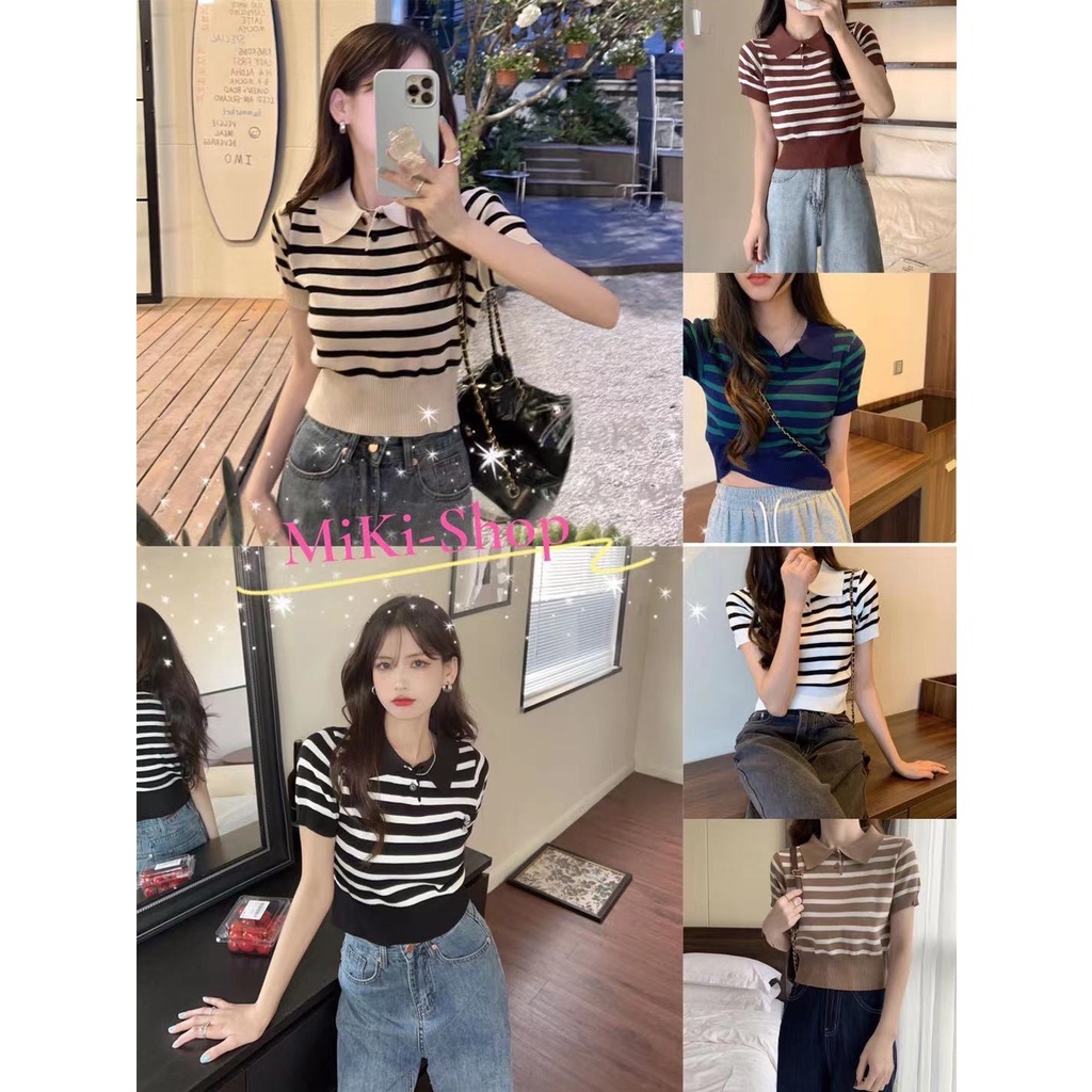❤️MiKI-Shop* 🤑พร้อมส่ง เสื้อครอปไหมพรม คอปก ลายทาง ผ้านิ่มน่ารักมาก29019*