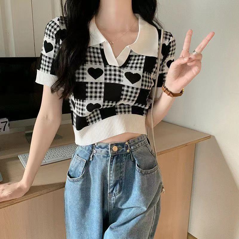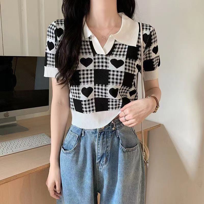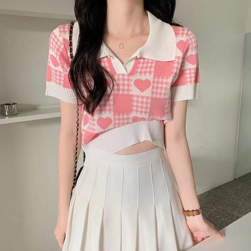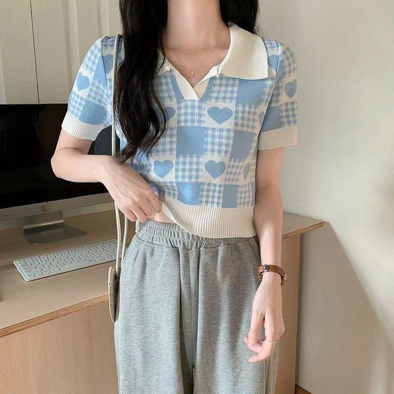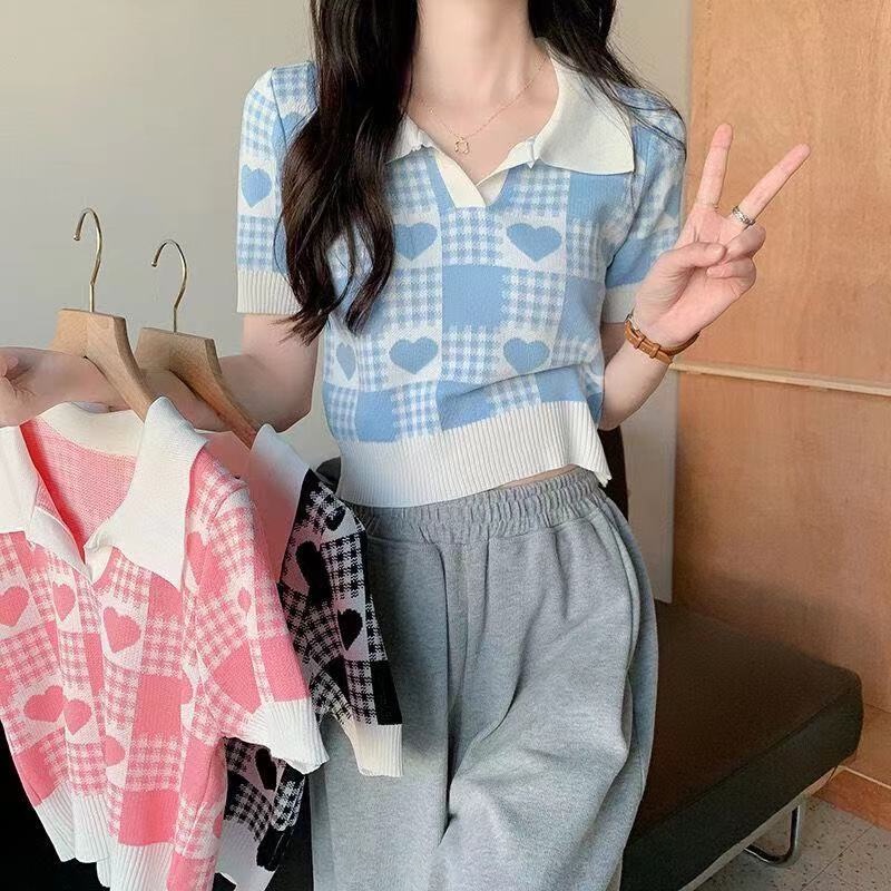 💕*Miki-Shop😍พร้อมส่ง*เสื้อครอปไหมพรม คอปก ดีเทลลายหัวใจน่ารักมาก 45611*