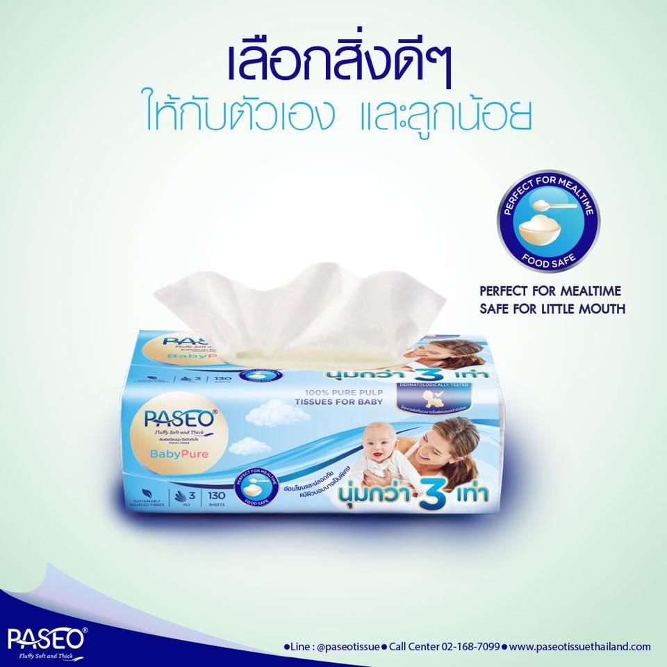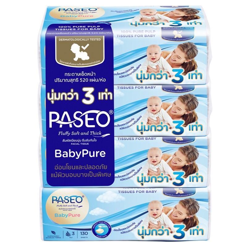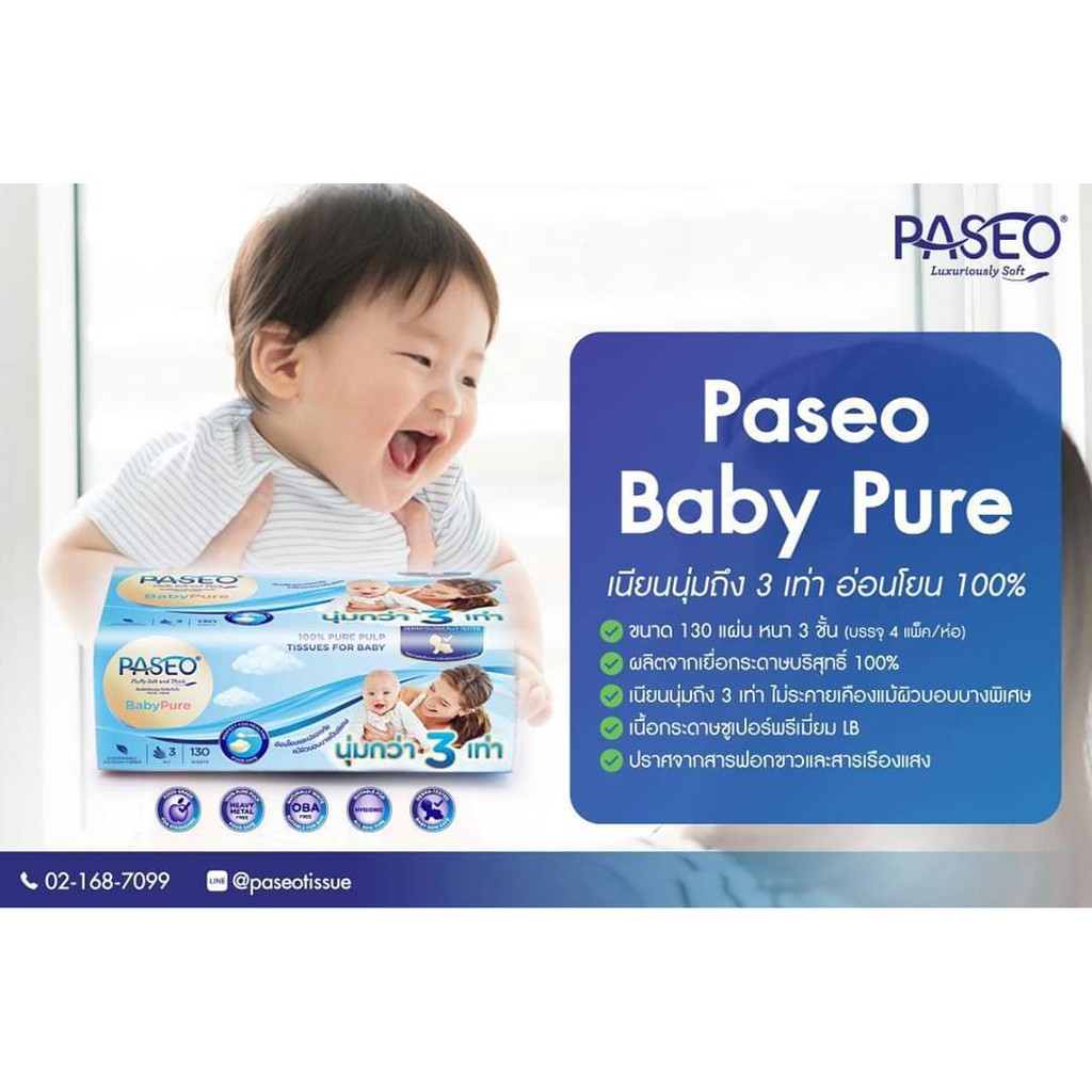 (แพ็ค 4 ห่อ) Paseo Baby Pure พาซิโอ กระดาษทิชชู กระดาษเช็ดหน้า สูตรอ่อนโยน หนา 3 เท่า 130 แผ่น ทิชชู่