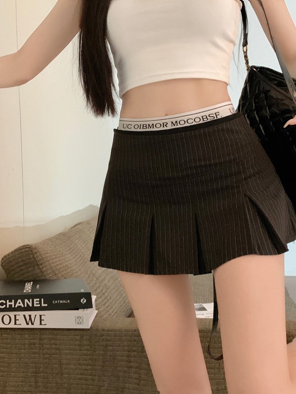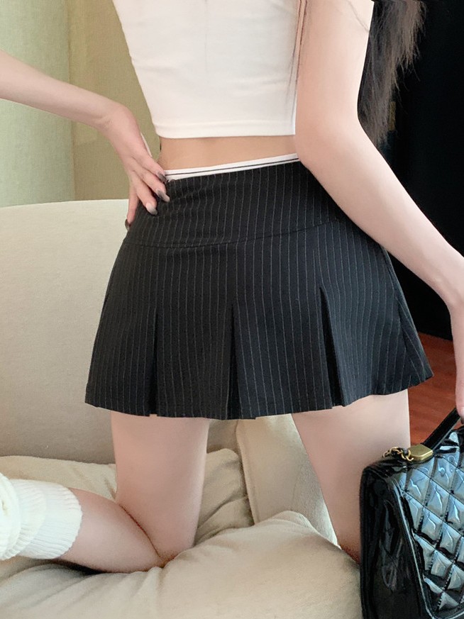 2สี กระโปรงสั้น กระโปรงสองชั้น เอวสูง ลายทางเอวยืด สไตล์Y2K #J333