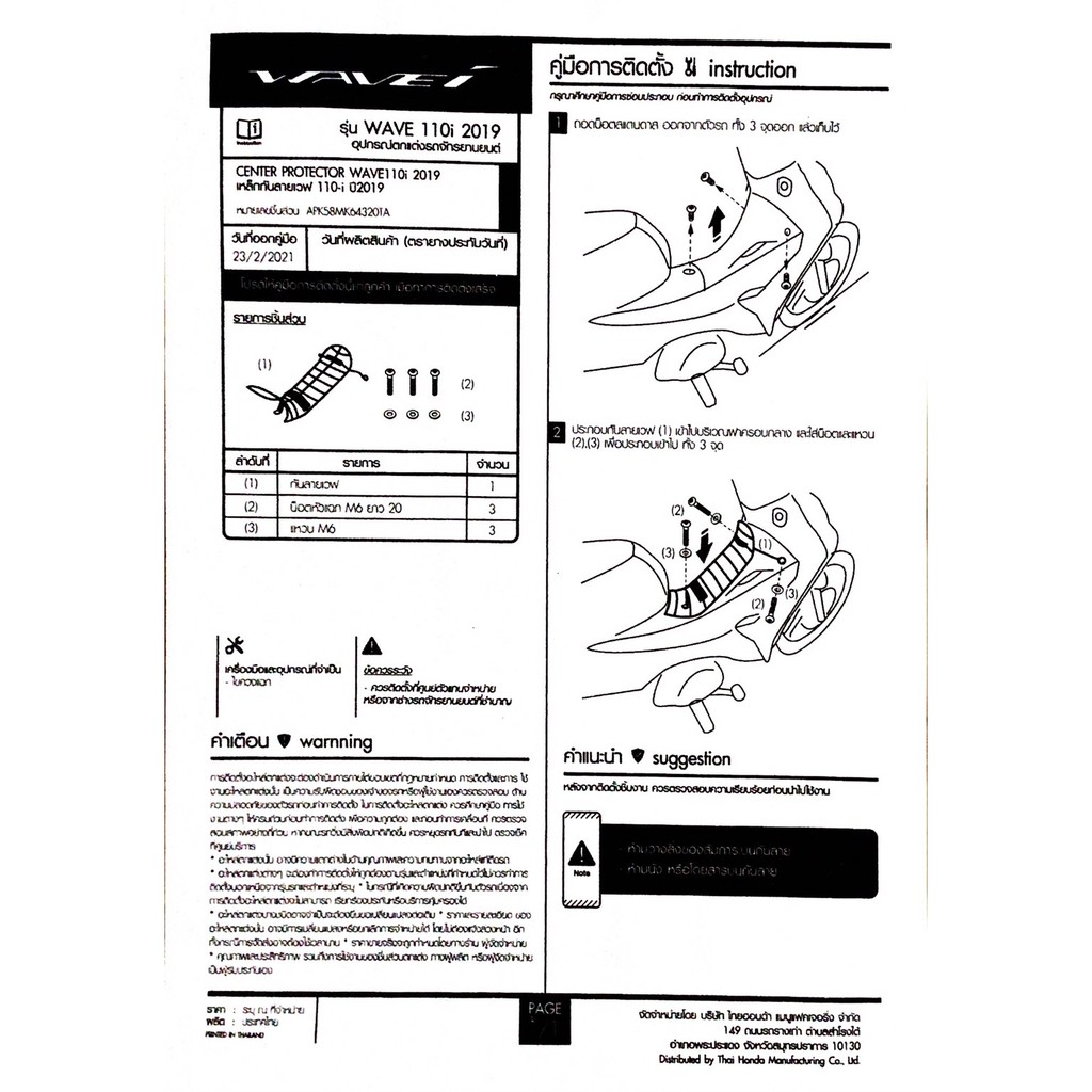 กันลาย Wave 110i รุ่นปี 2018 - 2025 ( ของแท้ Honda ) APK58MK64320TA