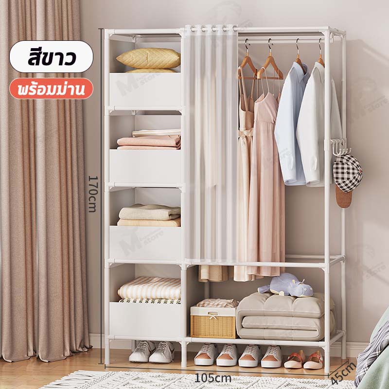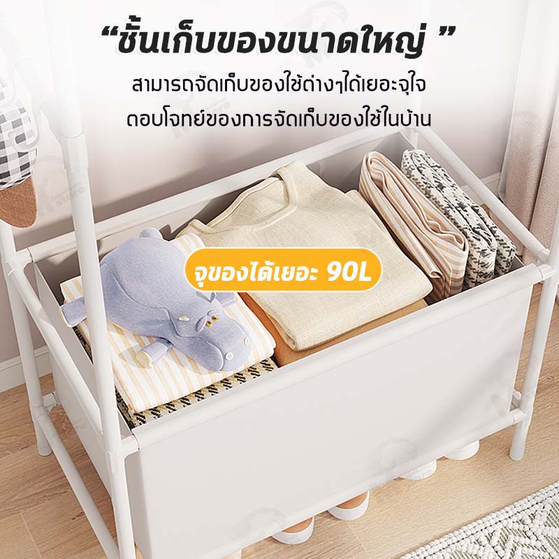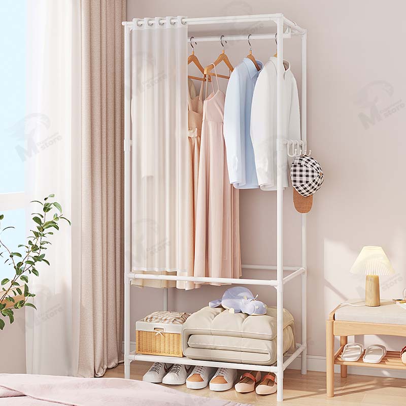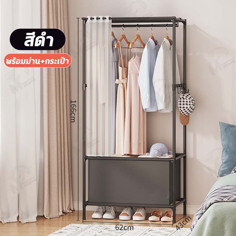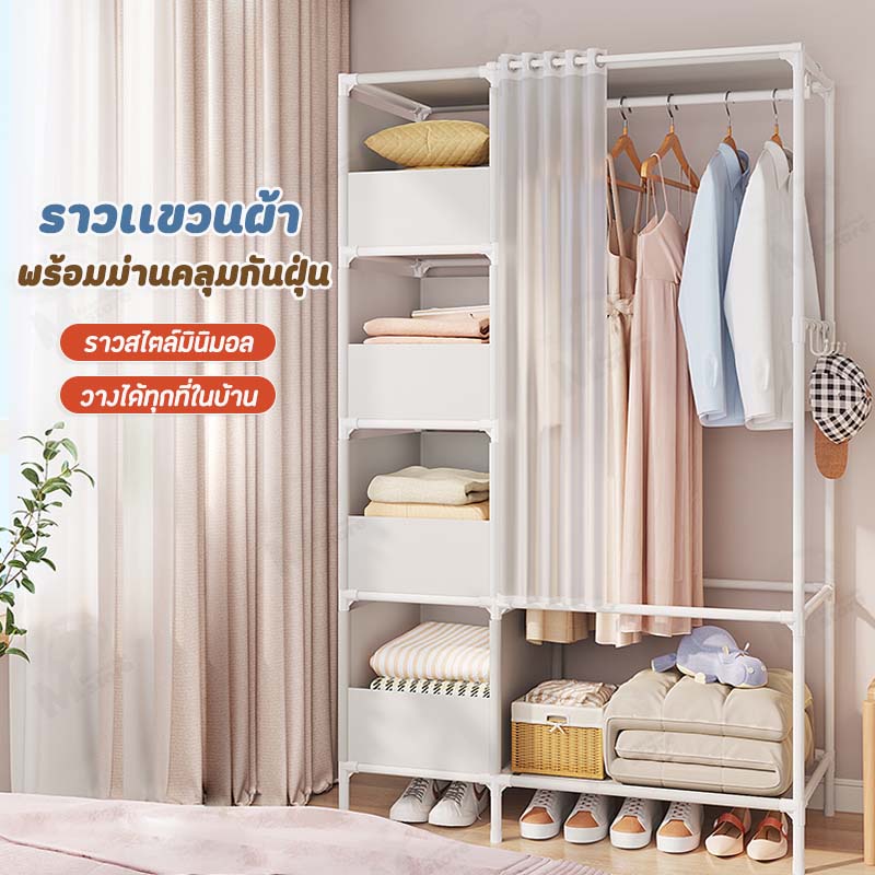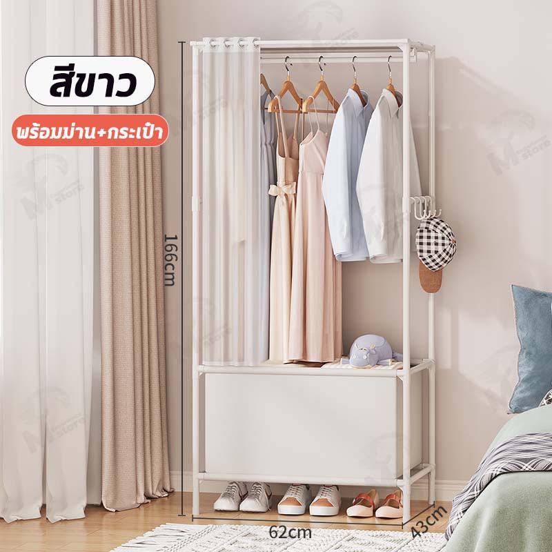 [ 3 in 1] ราวตากผ้า ราวเเขวนผ้า ราวตากผ้ามินิมอล พร้อมม่านคลุมกันฝุ่น ที่แขวนผ้า + ชั้นวางของอเน กประสงค์ (พร้อมส่ง) QB