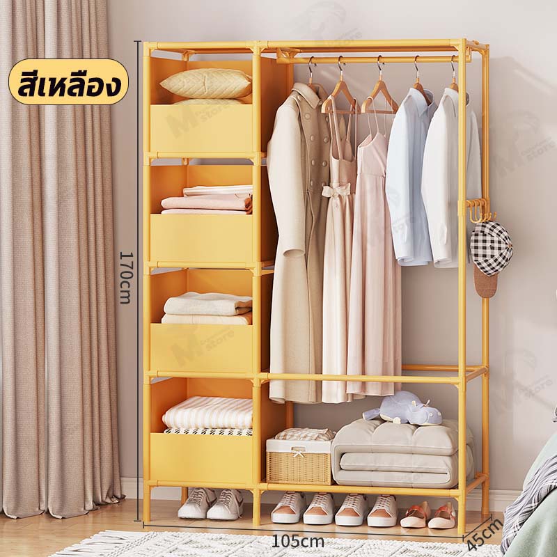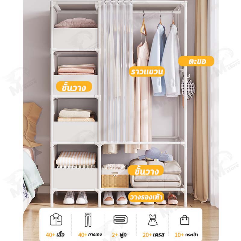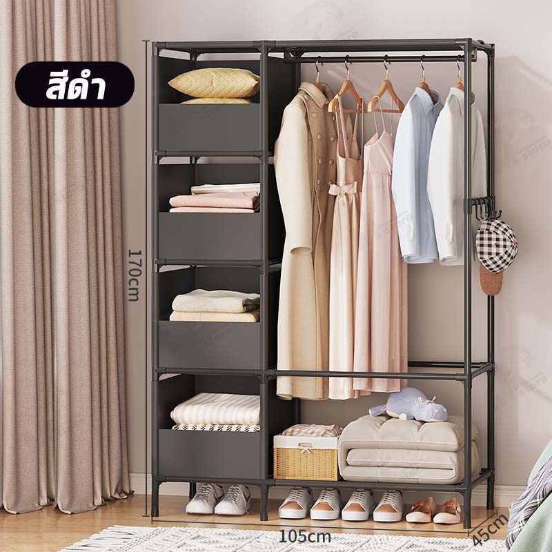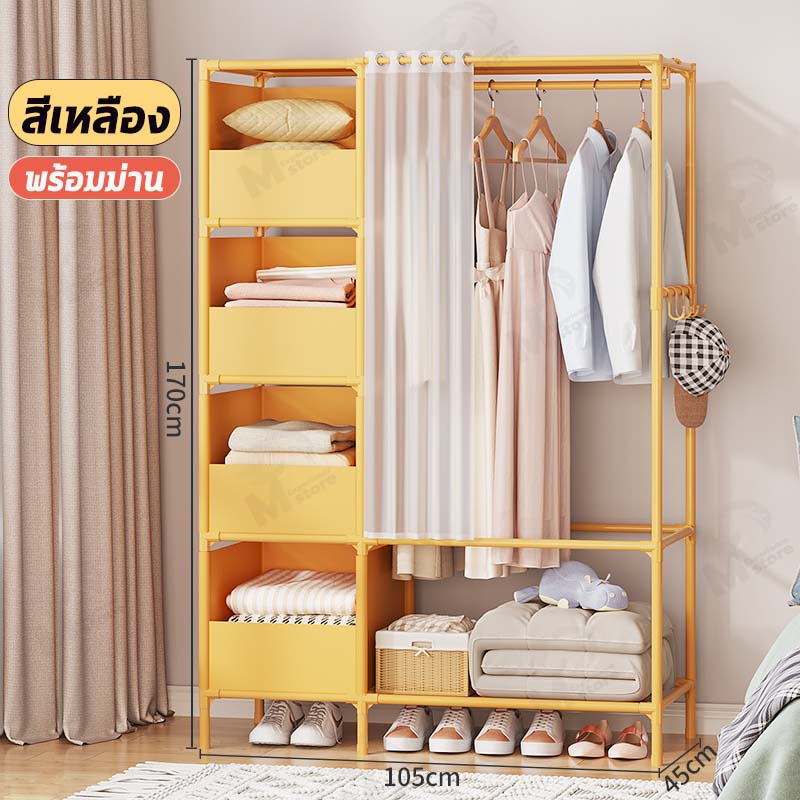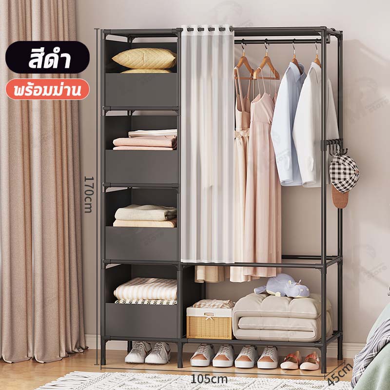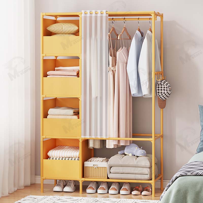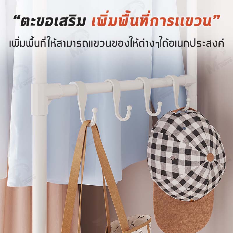 [ 3 in 1] ราวตากผ้า ราวเเขวนผ้า ราวตากผ้ามินิมอล พร้อมม่านคลุมกันฝุ่น ที่แขวนผ้า + ชั้นวางของอเน กประสงค์ (พร้อมส่ง) QB