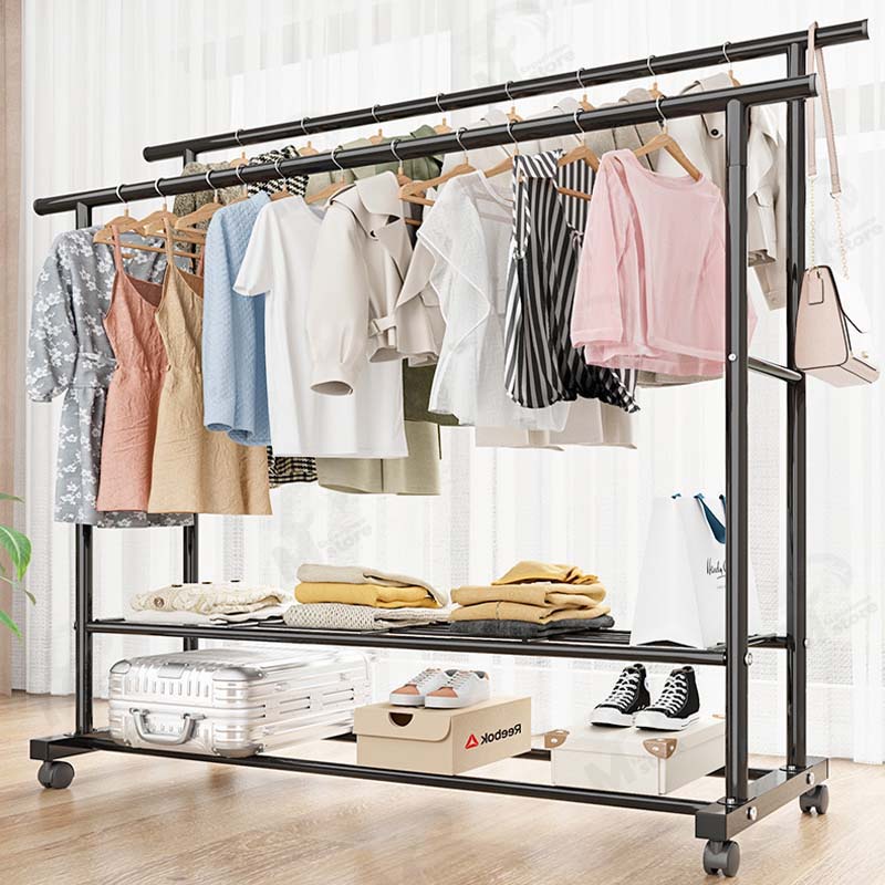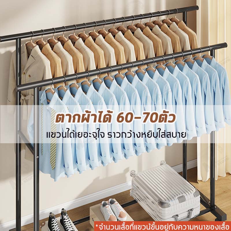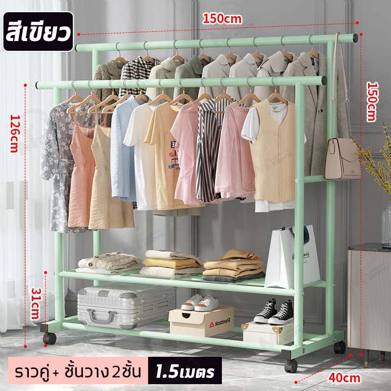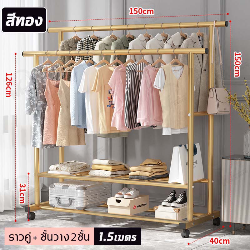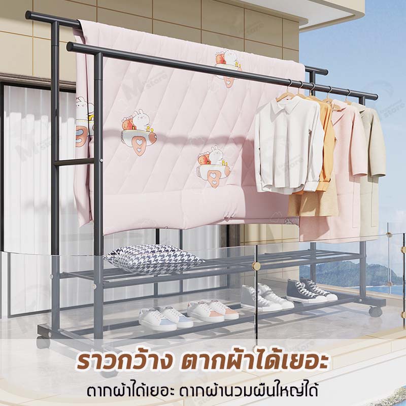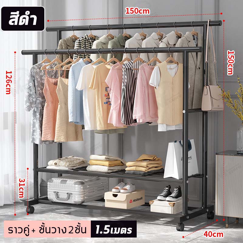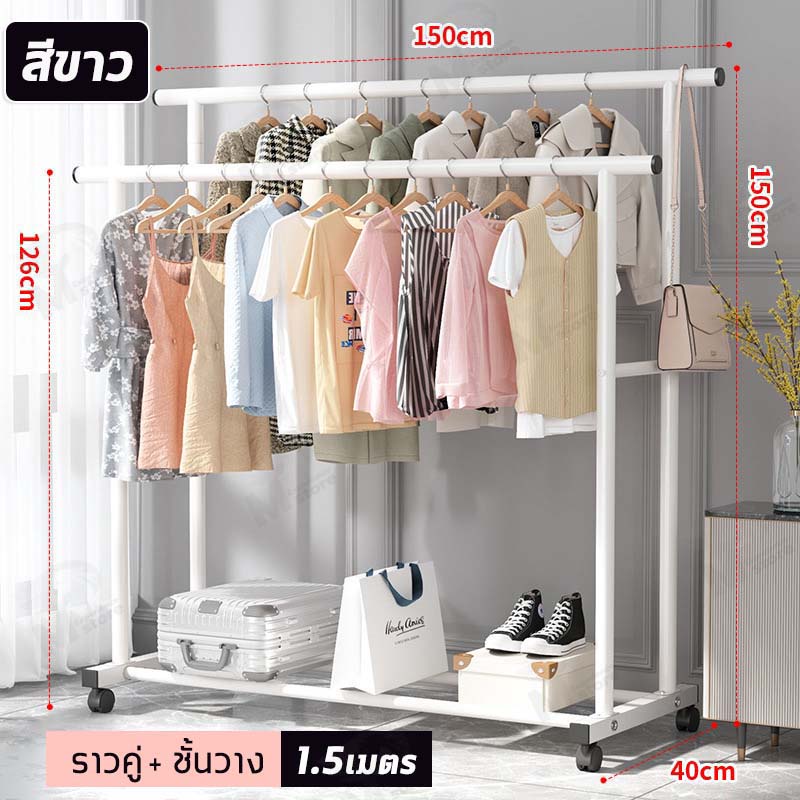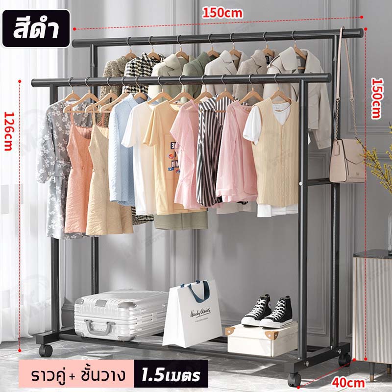 [ ราวคู่ ] ราวตากผ้า ราวแขวนผ้า ราวเหล็กมีล้อ บาร์คู่ ชั้นวาง2ชั้น โครงเหล็ก รับน้ำหนักได้ 20+kg พร้อมส่ง JH