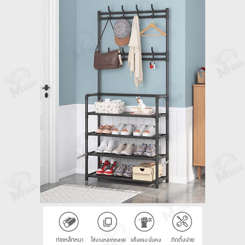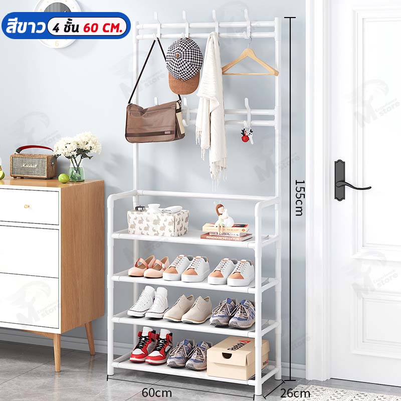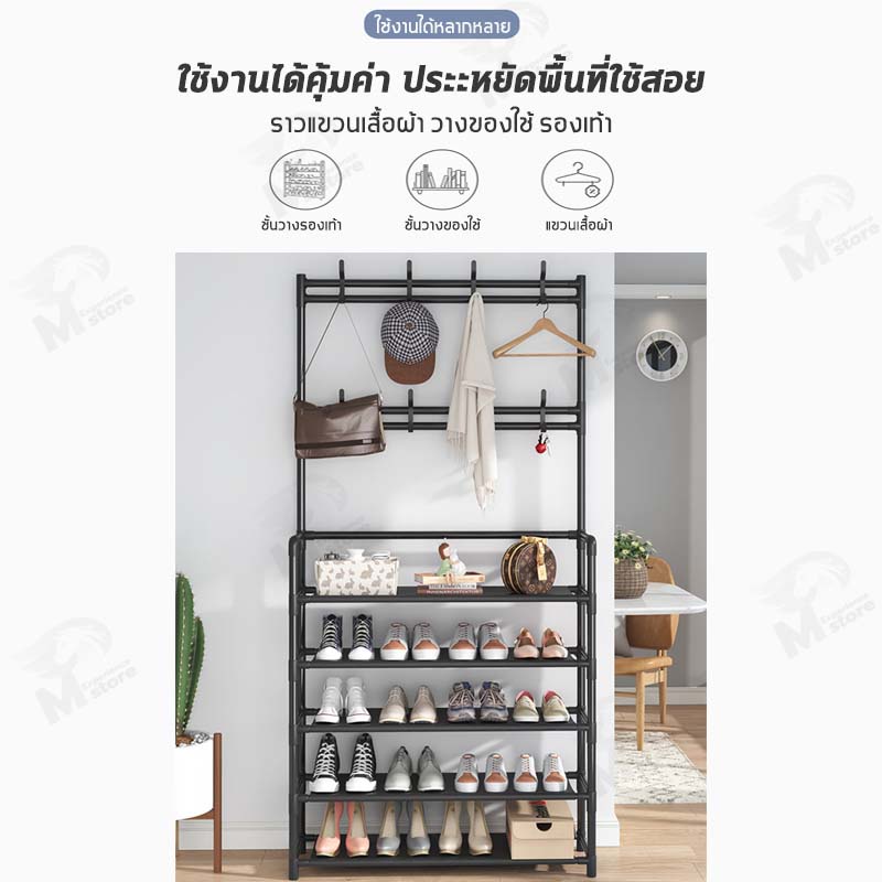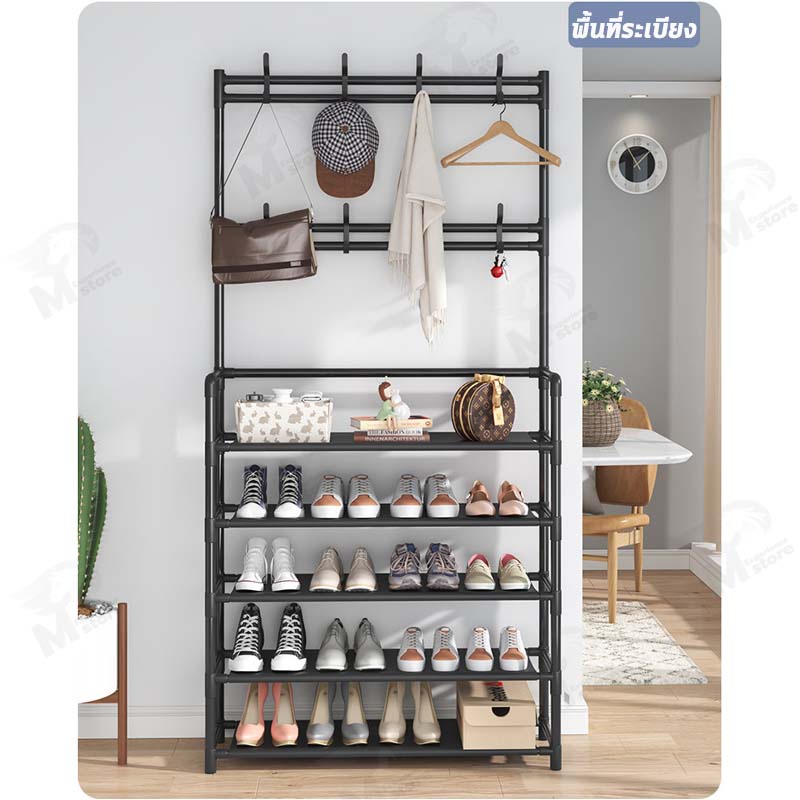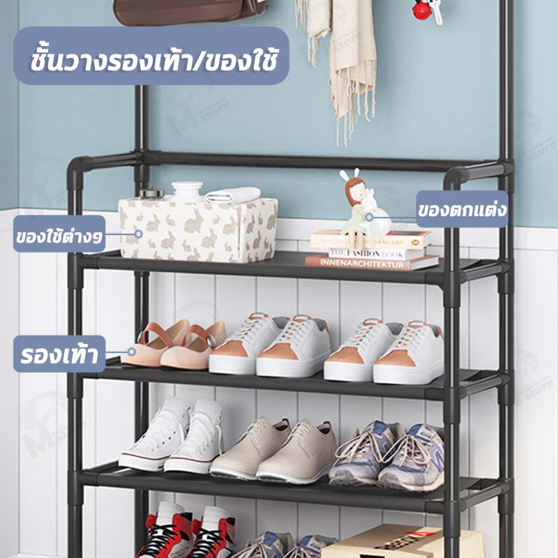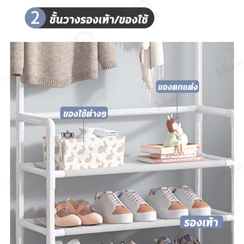 [2IN1] ราวแขวนเสื้อผ้า พร้อมตะขอแขวนเสื้อ+หมวก มีที่วางรองเท้า ชั้นวางเป็นผ้า non woven กันน้ำ XM