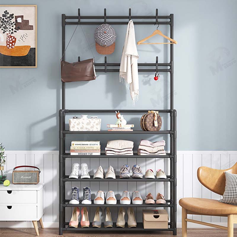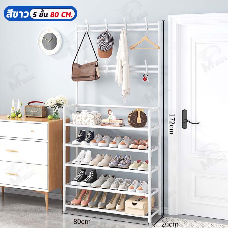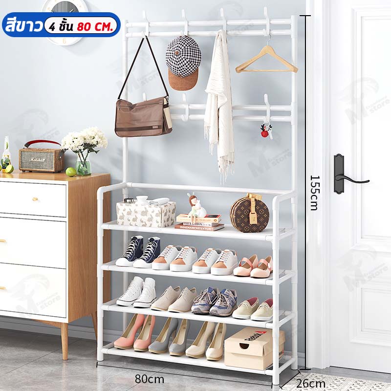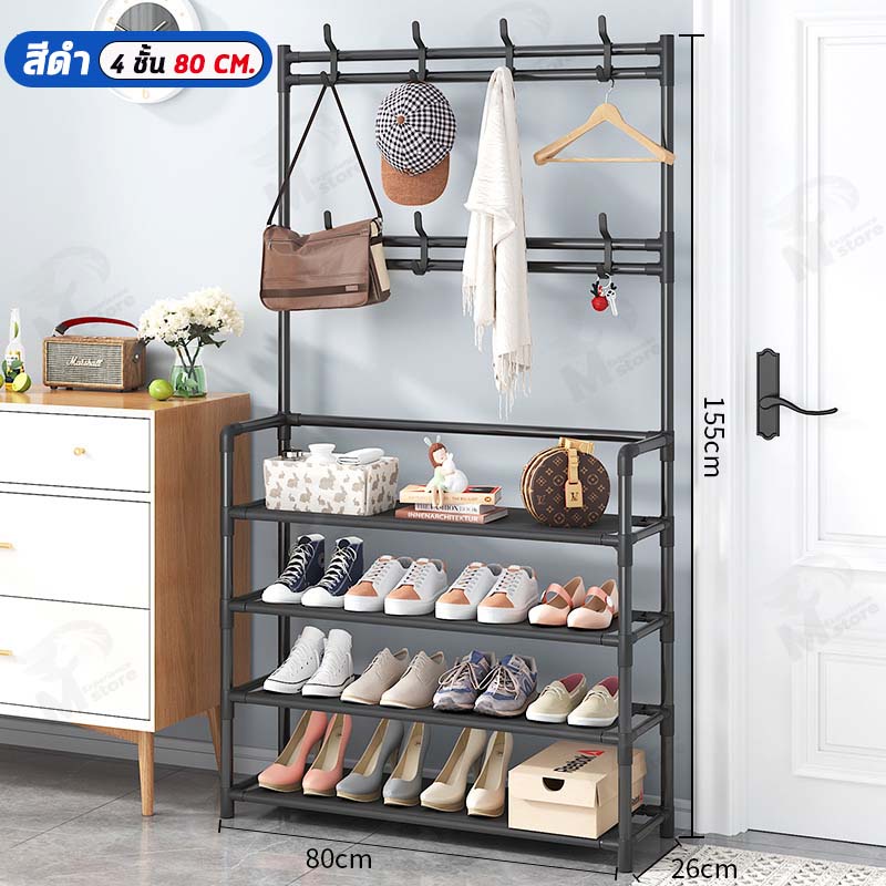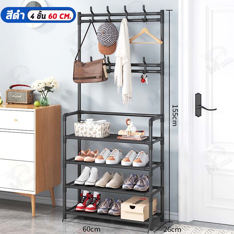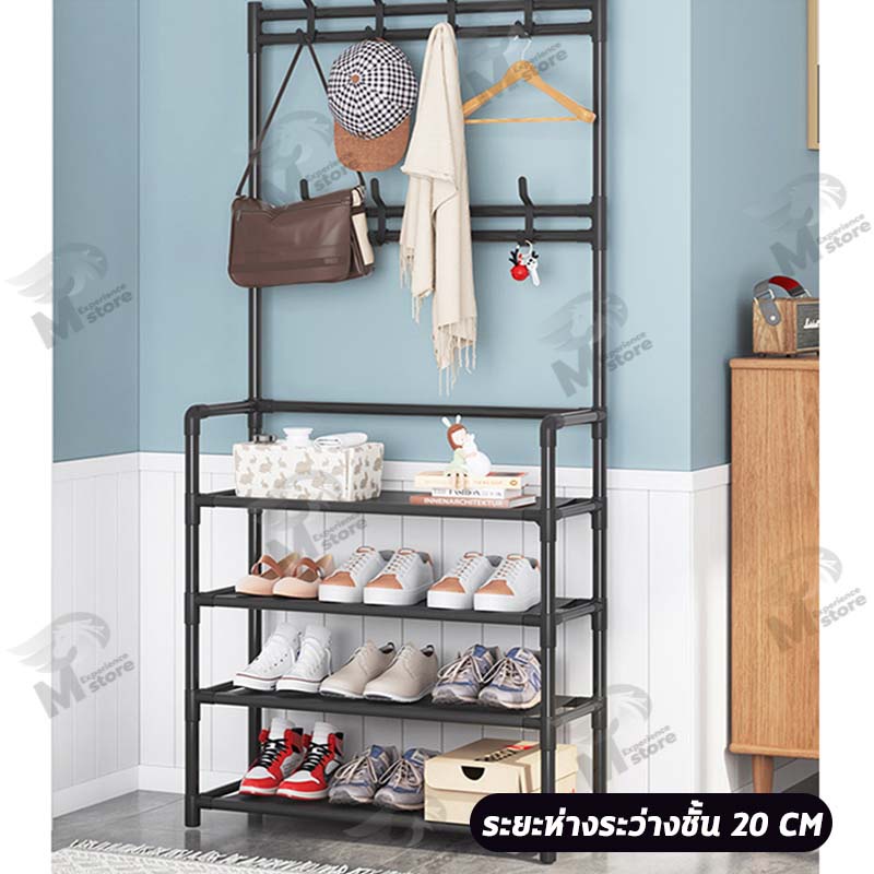 [2IN1] ราวแขวนเสื้อผ้า พร้อมตะขอแขวนเสื้อ+หมวก มีที่วางรองเท้า ชั้นวางเป็นผ้า non woven กันน้ำ XM