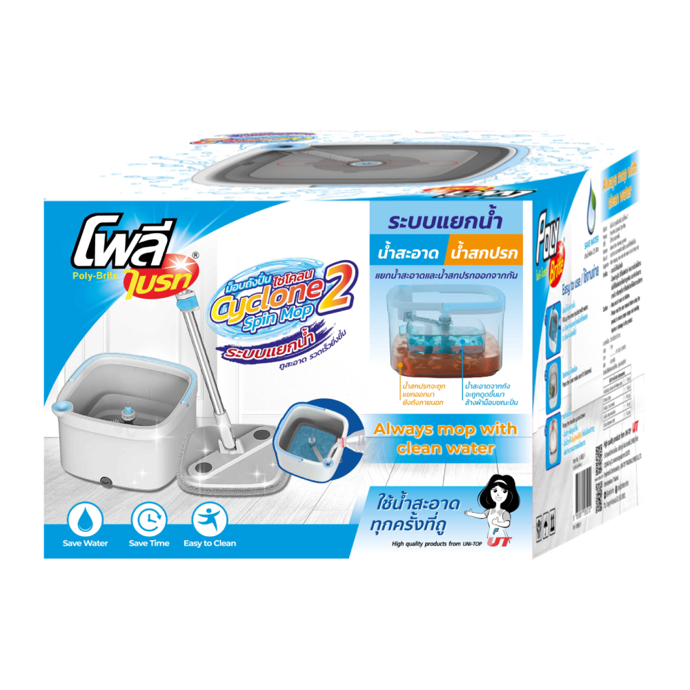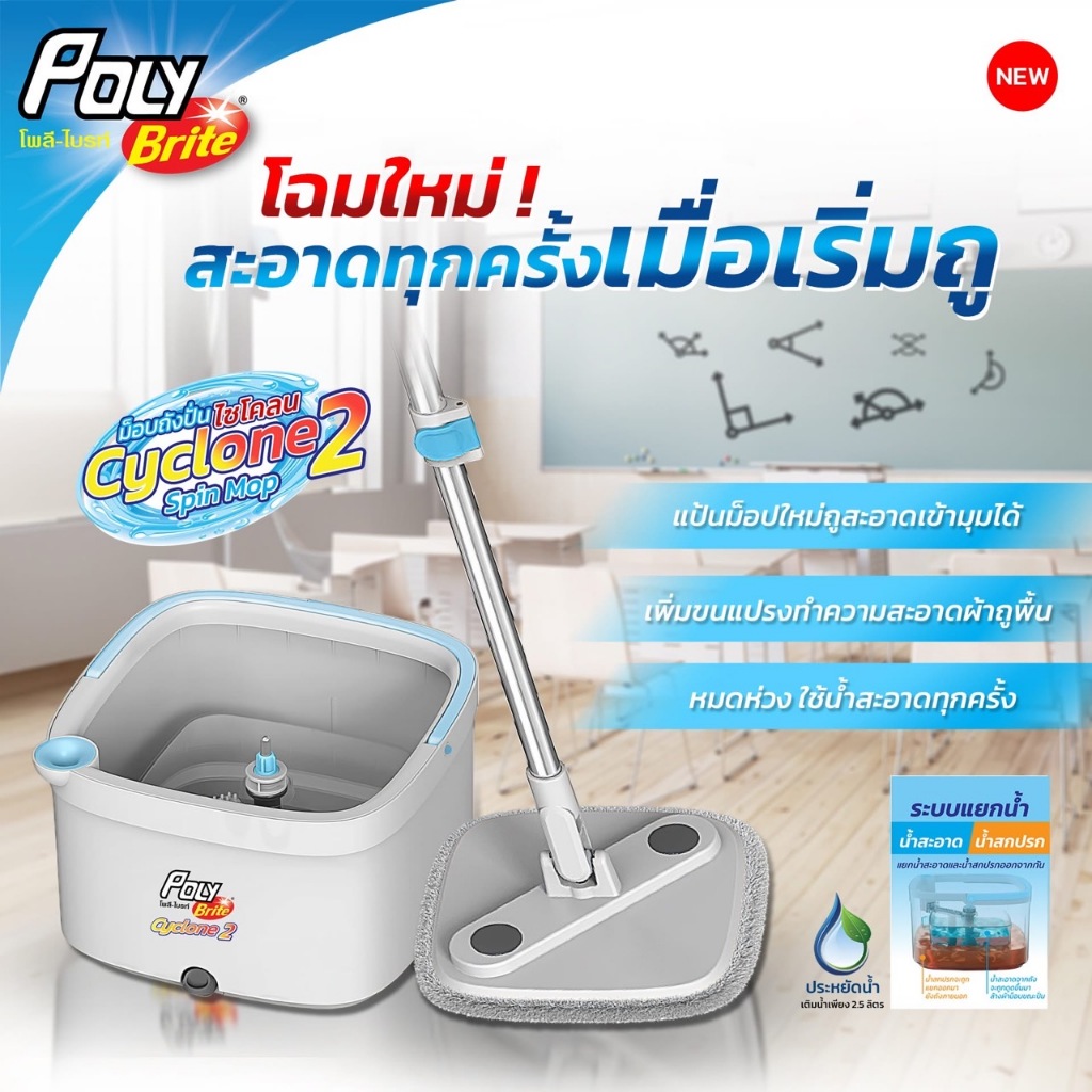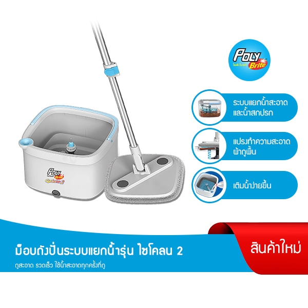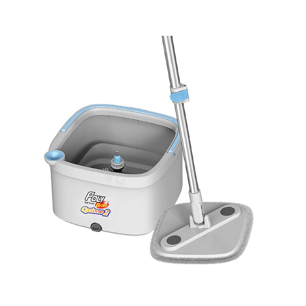Poly-Brite โพลี-ไบรท์ ชุดถังปั่น รุ่นไซโคลน 2 ระบบแยกน้ำ แป้นเหลี่ยมเข้ามุมดีเยี่ยม ไม้ถู พื้น พร้อมถังปั่น ม็อบถังปั่น