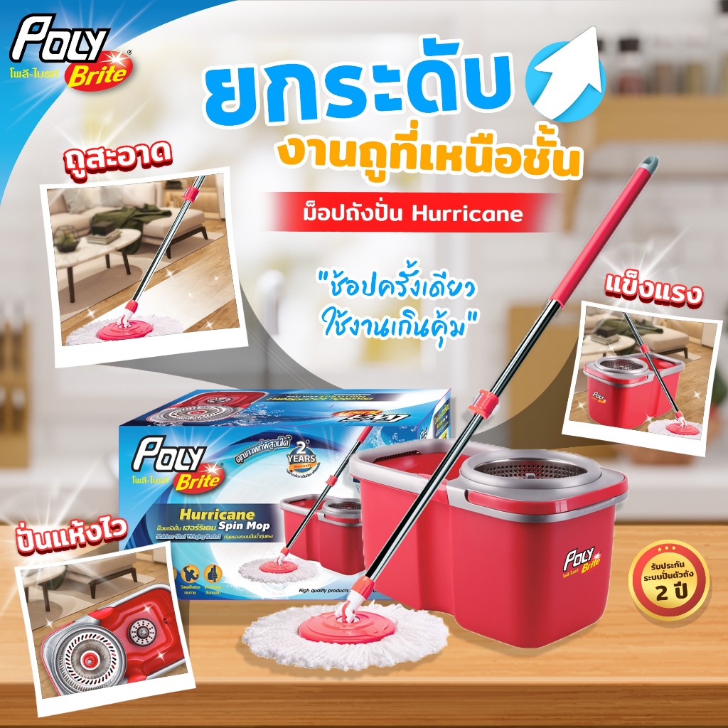 Poly-Brite โพลี-ไบรท์ ชุดถังปั่น รุ่นเฮอร์ริเคน ม็อบถังปั่น ไม้ถูพื้น พร้อมถังปั่น ไม้ถูพื้นปั่นแห้ง ปั่นลื่น เบาแรง