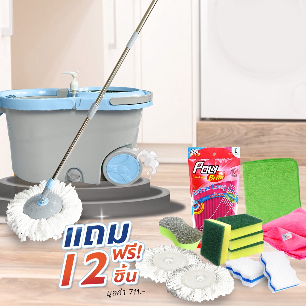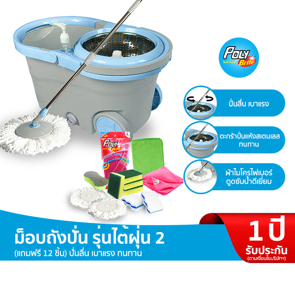 Poly-Brite โพลี-ไบรท์ ชุดถังปั่น รุ่นไต้ฝุ่น 2 (ฟรี! ของแถม 12 ชิ้น) ไม้ถูพื้น พร้อมถัง ไม้ถูพื ้นปั่นแห้ง