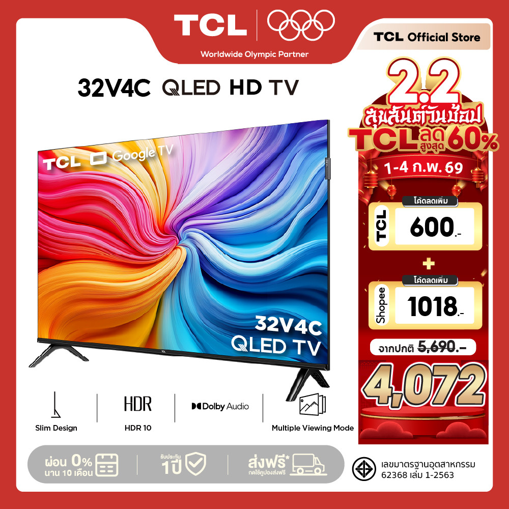 NEW 2025 TCL ทีวี 32 นิ้ว HD QLED Google TV รุ่น 32V4C รองรับ YouTube/Voice Search