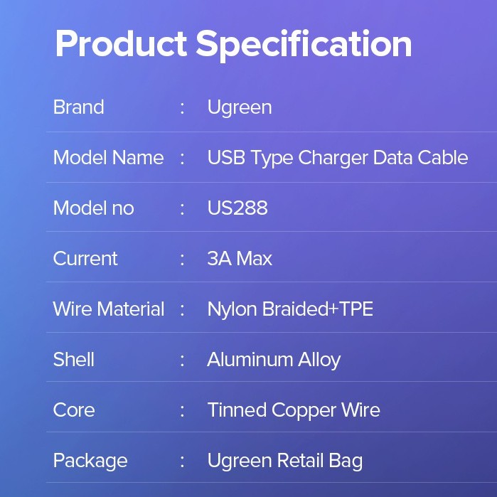 UGREEN สายชาร์จเร็ว USB Type C 3A Fast Charge & Data Cable สายชาร์จไนลอน Type C รุ่น US288