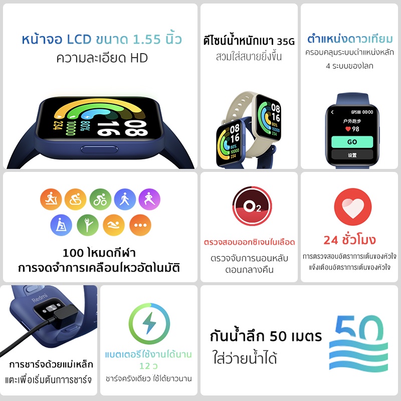 Xiaomi Redmi Watch 2 Lite มี GPS Waterproof Smartwatch SpO2 วัดออกซิเจนในเลือด สมาร์ทวอทช์