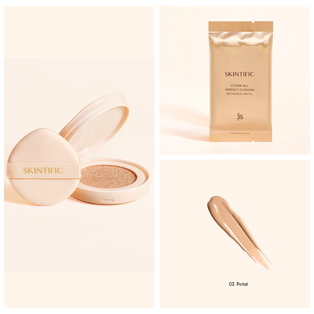 SKINTIFIC COVER ALL PERFECT CUSHION SPF35+ PA+++ คุ ชชั่นเพื่อผิวเรียบเนียน คุมมัน 24ชม. ปกปิดรอยสิวและจุดด่างดำ คุชชั่นสูตรโกลว์ ตลับทอง คุชชั่นให้ผิวสวยเรียบเนียน ติดทนตลอดวัน