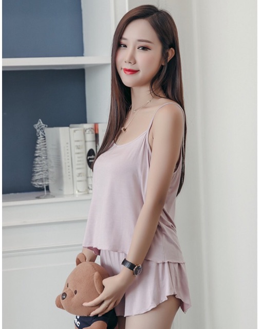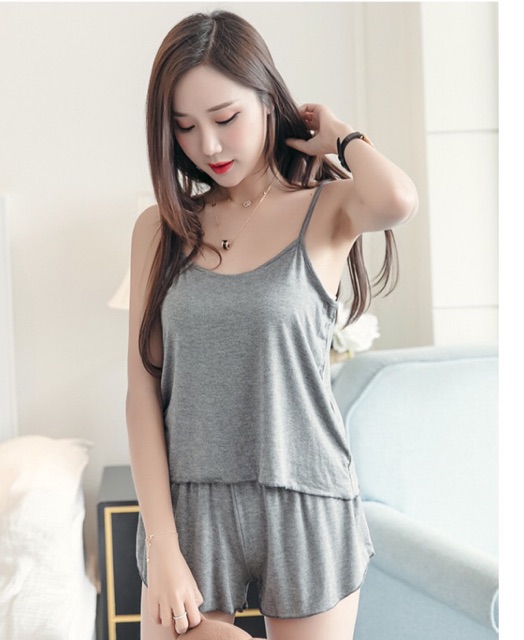 ชุดนอน 2 ชิ้น(กางเกงขาสั้น+เสื้อสายเดี่ยว) สไตล์เกาหลี เนื้อผ้านิ่ม ยืดหยุ่นดี ใส่สบาย เทา/ชมพู/ฟ้า/กรมท่า/ม่วง