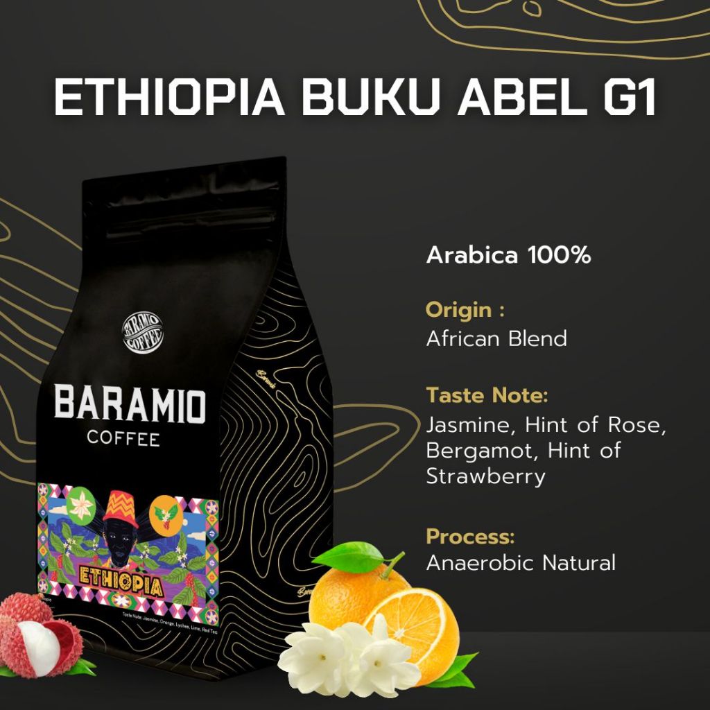 Baramio เมล็ดกาแฟ Ethiopia Buku Abel G1 200-500 g. (Arabica100%) Taste Note: Lychee, Jasmine, Red tea, Orange