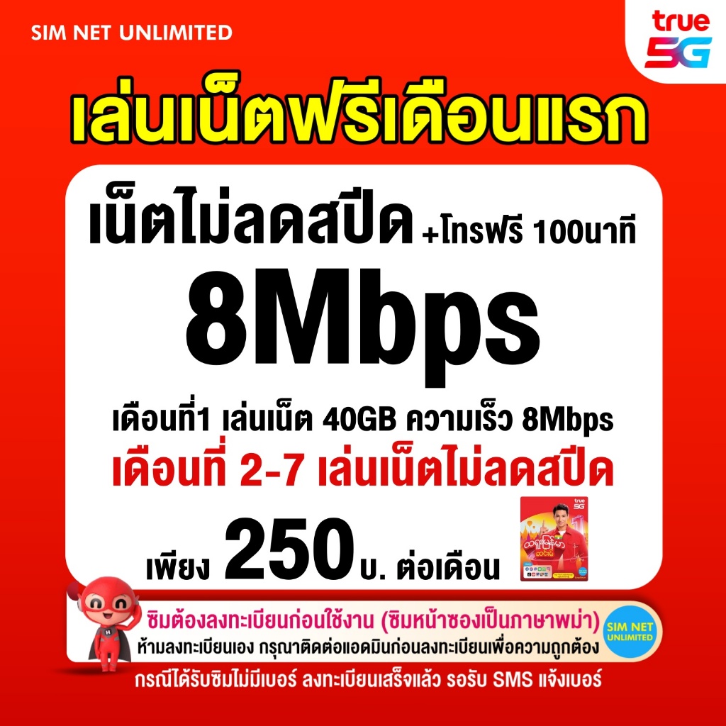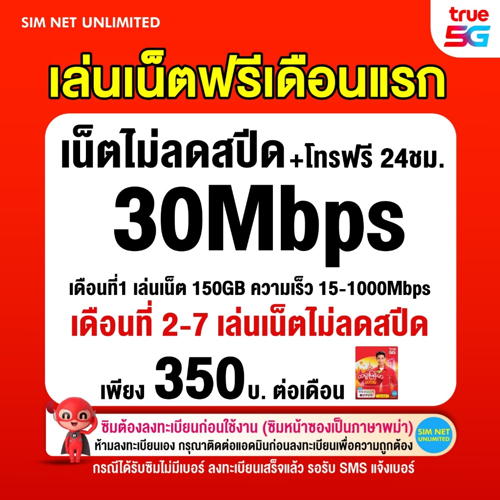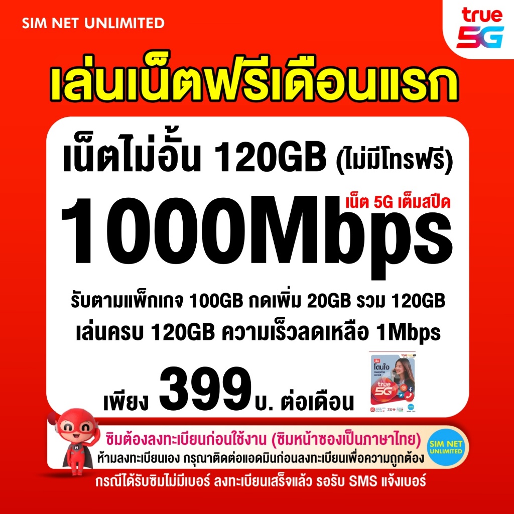 (เล่นฟรีเดือนแรก) ซิมเทพ true เล่นเน็ตไม่อั้น ความเร็ว 1000Mbps (พร้อมใช้ฟรี true wifi ทุกแพ็กเกจ)