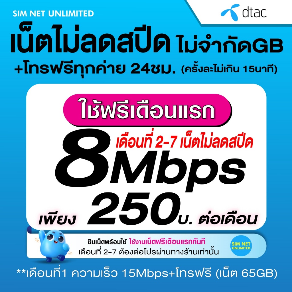(เล่นฟรีเดือนแรก) ซิมเทพเล่นเน็ตไม่อั้น +โทรฟรี 24ชม. ความเร็ว 30Mbps (ใช้ฟรี wifi ทุกแพ็กเกจ)
