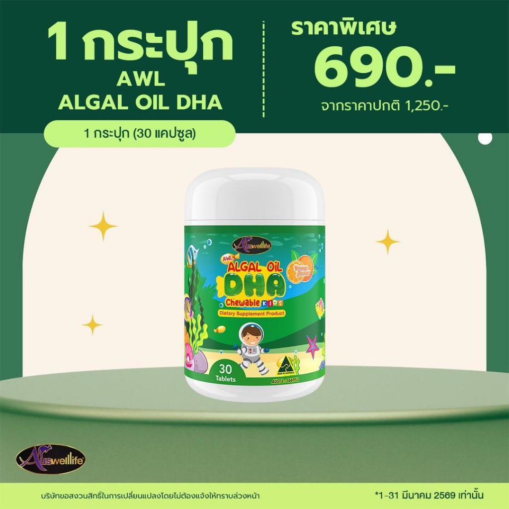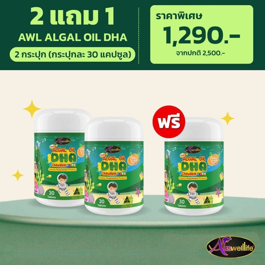 Auswelllife DHA 350 mg. อาหารเสริมเด็ก ดีเอชเอ สำหรับเด็ก น้ำมันสาหร่าย แม่หนิง Algal Oil บำรุงสมอง