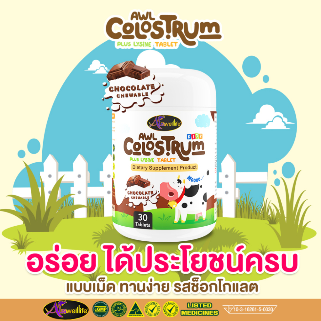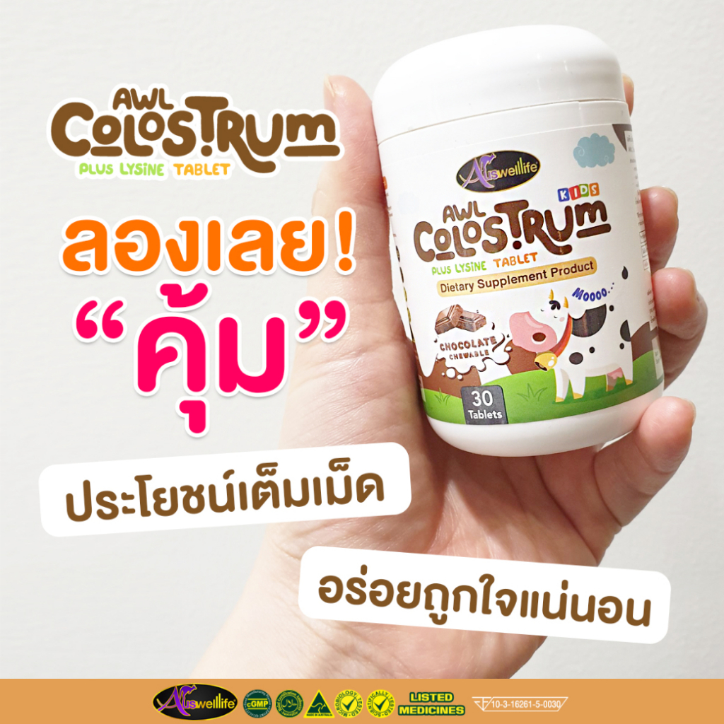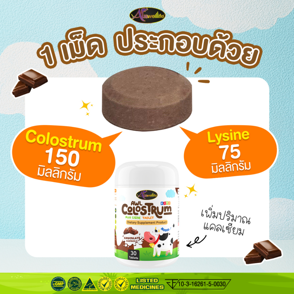 AWL Colostrum Plus Lysine 3 แถม 2 อาหารเสริมสำหรับเด็ก Auswelllife นมโคลอสตรุ้ม นมเม็ดผสมไลซีน