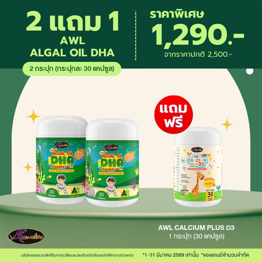 AWL DHA Algal Oil 30 แคปซูล 2 แถม Calcium 1 อาหารเสริมเด็ก ออสเวลไลฟ์ Auswelllife DHA สำหรับเด็ก