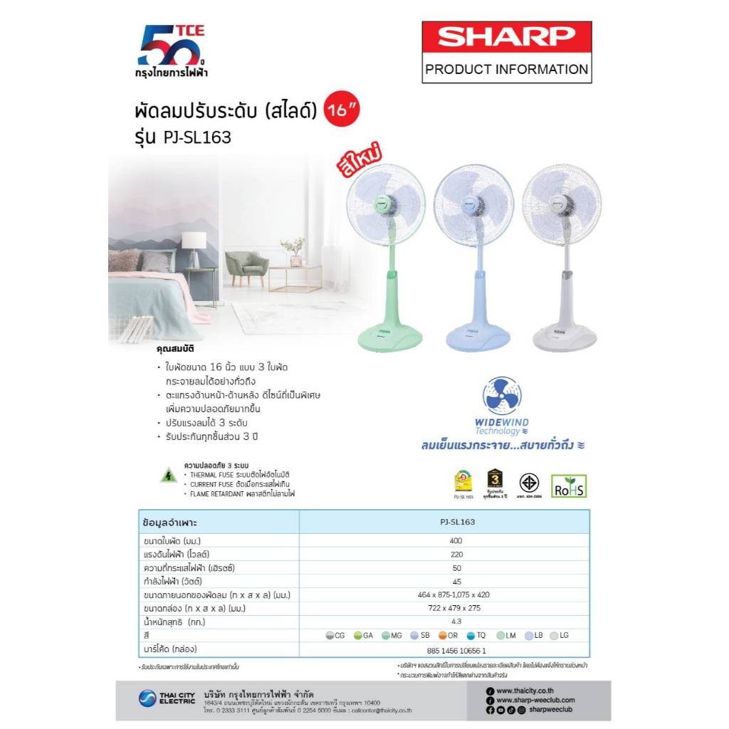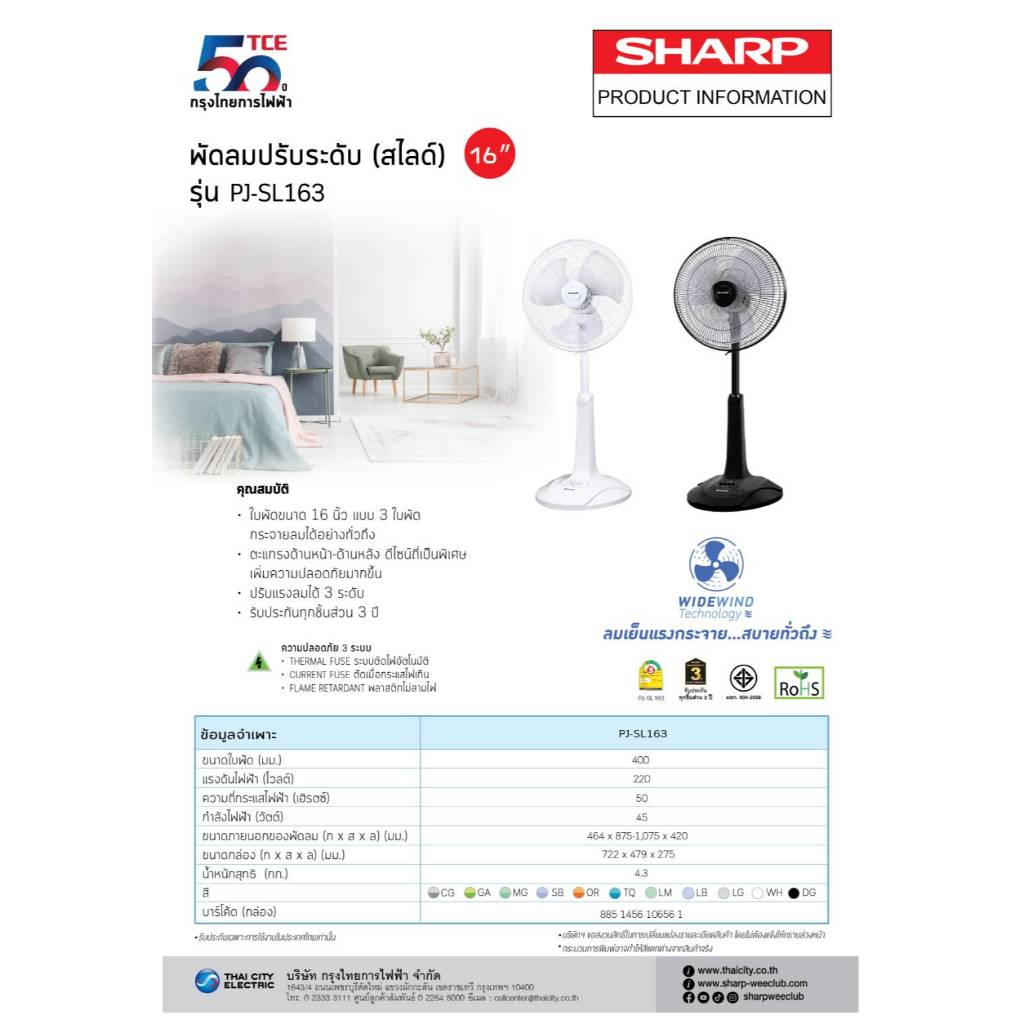 SHARP พัดลมสไลด์ 16 นิ้วรุ่นใหม่ PJ-SL163,164 (ของแท้รับประกันศูนย์)
