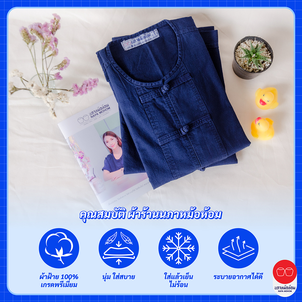 นภาหม้อห้อม - เสื้อคอกลม แขนสั้น กระดุมจีน ปักลาย ดอกเขียว