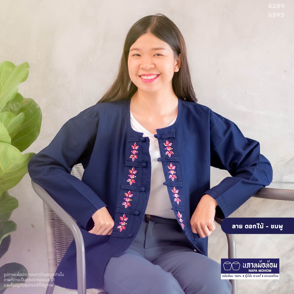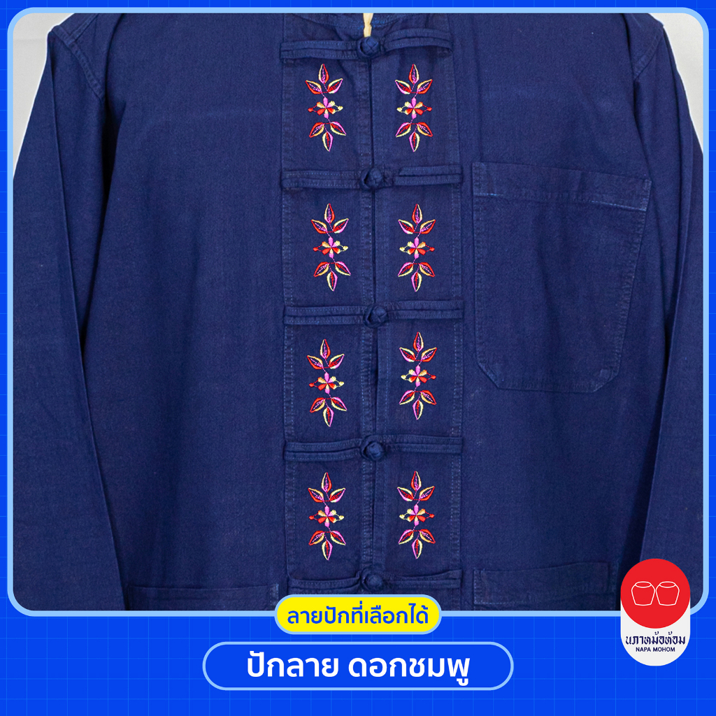 นภาหม้อห้อม - เสื้อคอกลม แขนยาว กระดุมจีน ปักลาย ดอกชมพู
