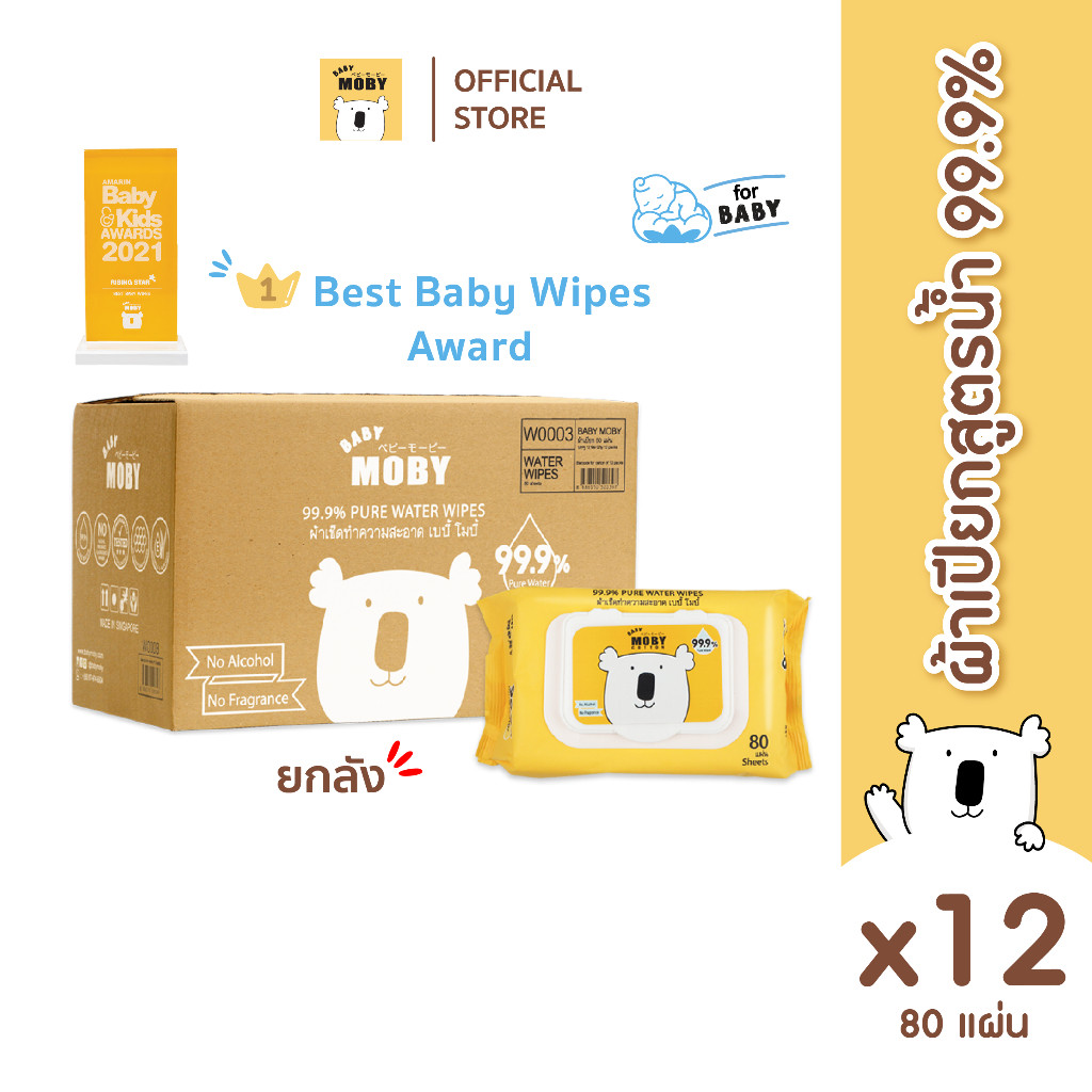 Baby Moby ผ้าเปียก 99.9% เพียววอเตอร์ (ยกลัง 12 ห่อ) 80 แผ่น/ห่อ ผ้าเปียก