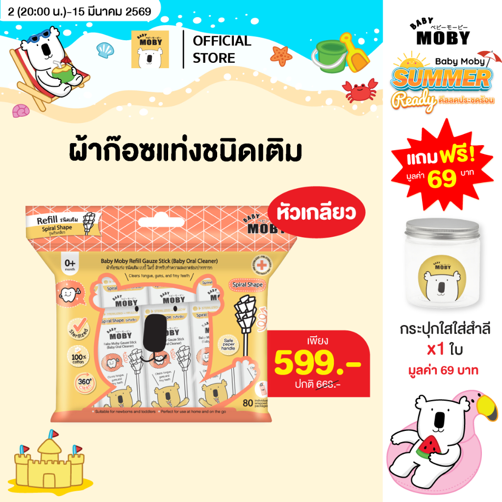 Baby Moby (แถมเฉพาะตัวเลือก รีฟีลหัวเกลียว+ปุกใส) ผ้าก๊อซ ชนิดแท่ง รุ่นหัวเกลียว(1กระปุก) หรือ ชนิดรีฟิล (80ชิ้น/ห่อ)